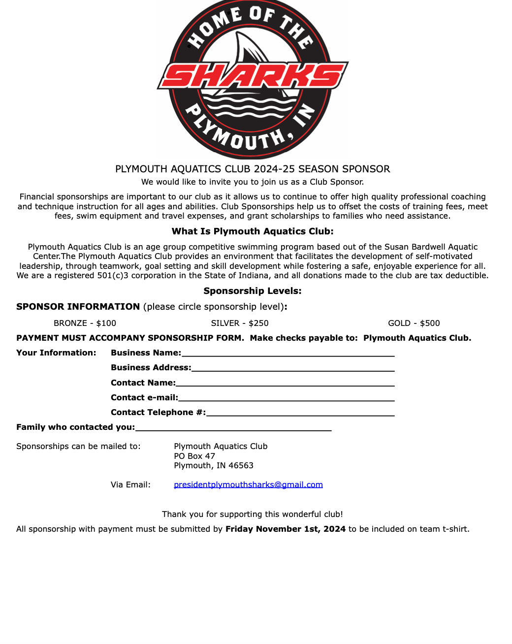 Throughout the year, our club will host Sharkfest (our invitational swim meet and one of our largest team fundraisers) As the host for this event, it is our responsibility to provide participating athletes and their families with a positive experience. To accomplish this, we would like to be able to highlight local businesses that may serve their needs. WHO ARE THE SHARKS?