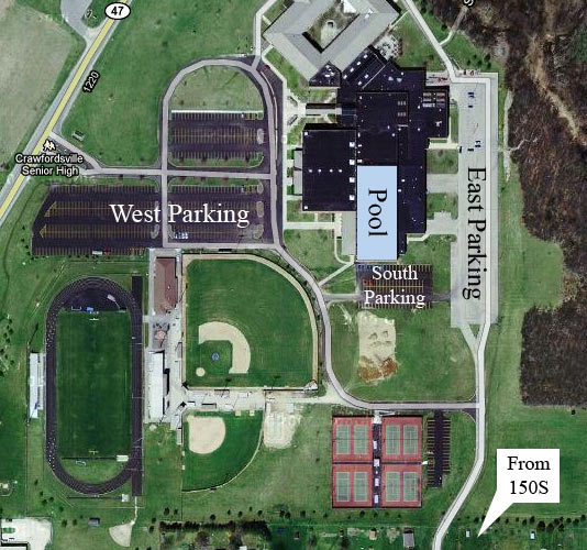 - All swimmers and families should park in the South and West parking lots (see map below) and enter the building through doors 28 and 30. The doors on the back side of the building will NOT be open for entrance.