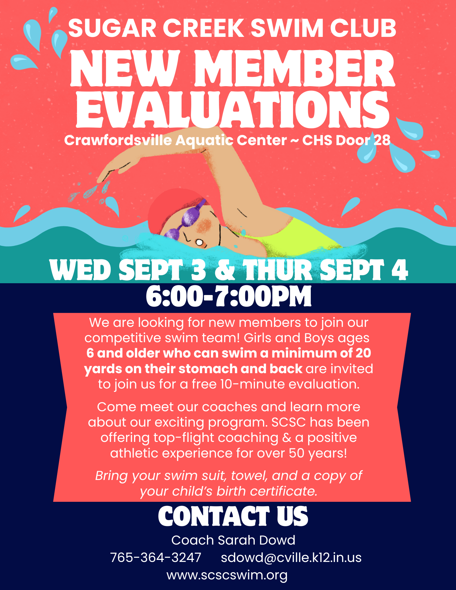 Click below for information about... 2025-2026 Short Course Season Information New Member Evaluations 2025-2026 Short Course Practice Schedule 2025-2026 Short Course Meet Schedule Team Sponsorship & New Scoreboard Flyer Parent resources from USA Swimming