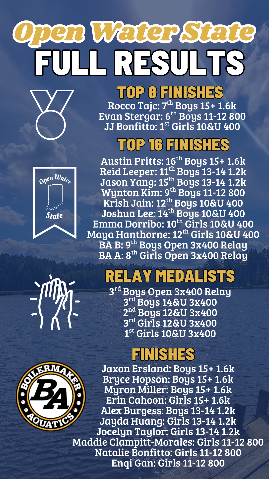 Congratulations to all of our BA athletes who participated in the 2025 Indiana Open Water State Championship! It takes a lot of courage to attempt something new and step into the unknown of open water swimming for the first time!