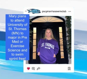 Mary Selden Mary Selden has committed to the University of St. Thomas (MN) to major in pre med or exercise science and to swim sprint free. Mary has been swimming competitively for about 8 years. Favorite stroke: Freestyle Favorite part about PSC is getting to race and have fun with her friends. Mary decided to continue to swim in college because she wants to push herself and get better at the next level. Best of luck Mary! Your PSC family will be cheering for you!!