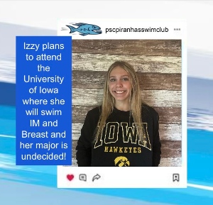 Izzy Heller Izzy Heller has committed to the University of Iowa. Izzy has been swimming competitively for about 11 years. Favorite stroke: Breaststroke The best part about swimming with PSC for Izzy is swimming with all her best friends and making amazing memories. Izzy decided to continue to swim in college because she wanted to keep doing what she loves and take on all the oppurtunities she has ahead. Best of luck Izzy! Your PSC family will be cheering for you!!