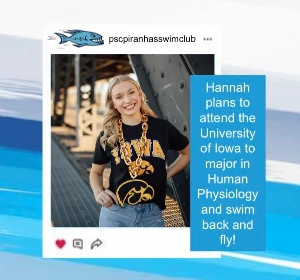 Hannah Cousins Hannah Cousins has committed to the University of Iowa to major in human psychology and swim back/fly for the hawkeyes. Hannah has been swimming competitively for about 12 years. Favorite stroke: Backstroke Favorite part about PSC is working hard with her best friends. Hannah decided to continue to swim in college because she wasn't ready to be done and excited what the future holds. Best of luck Hannah! Your PSC family will be cheering for you!!