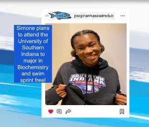 Simone Green Simone Green has signed to the University of Southern Indiana to major in biochemistry and to swim sprint free. Simone has been swimming competitively for around 9 years. Favorite stroke: Freestyle Favorite part about swimming is the swim meets! "After every race you get to see the progress you've made!" Simone decided to continue her academic and athletic career because she is not ready to give up swimming yet and she looks forward to what lies ahead. Best of luck Simone! Your PSC family will be cheering for...