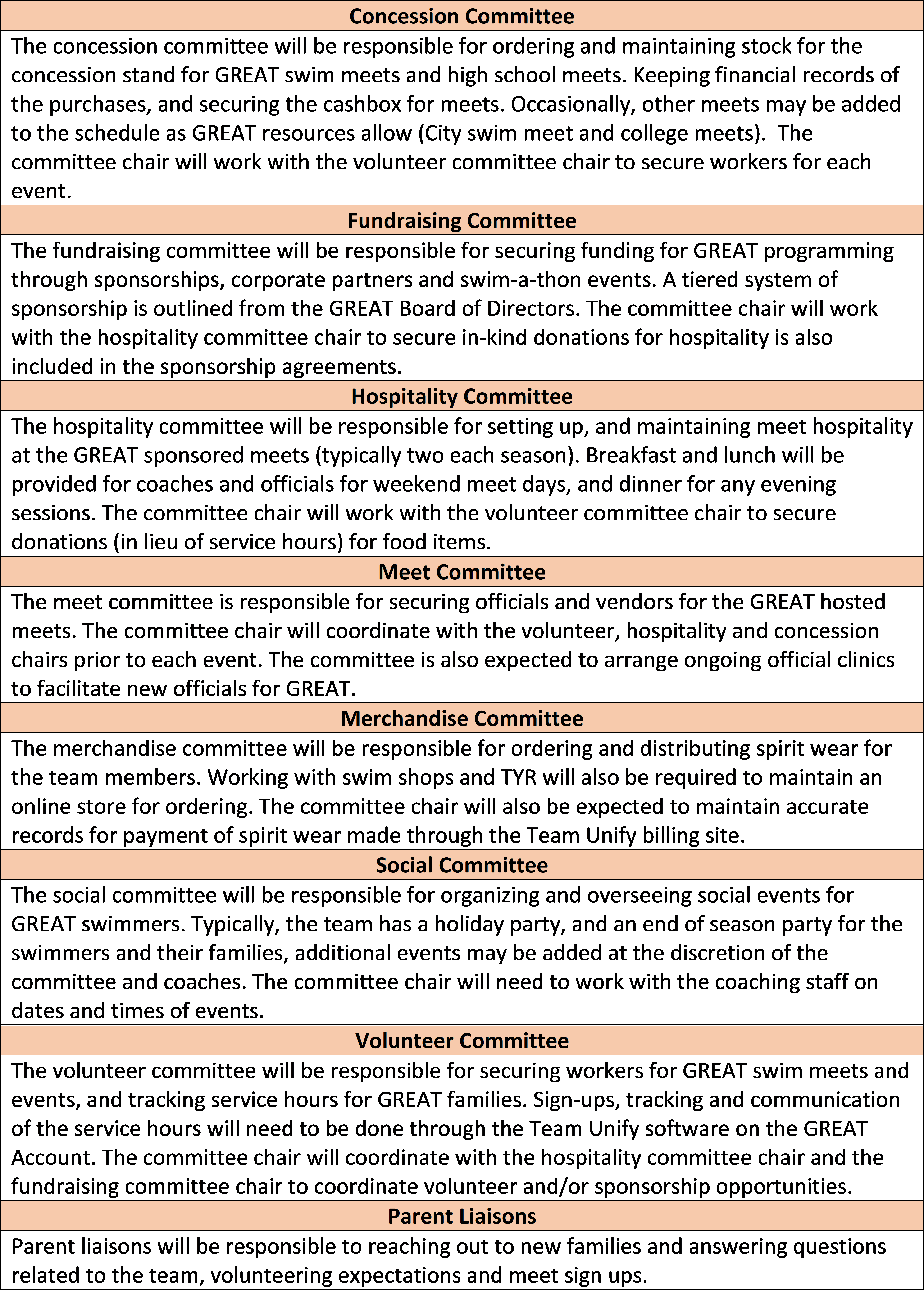 Other ways to help the team apart from meets is by being a parent liaison or becoming a member of one of our committees. Our committees are in place to ensure that important areas of the club are being observed by a dedicated group of individuals. While not always the case, our committee chairs are typically current board members. We understand that everyone’s time is limited, therefore being a member of these committees is not a large time commitment.