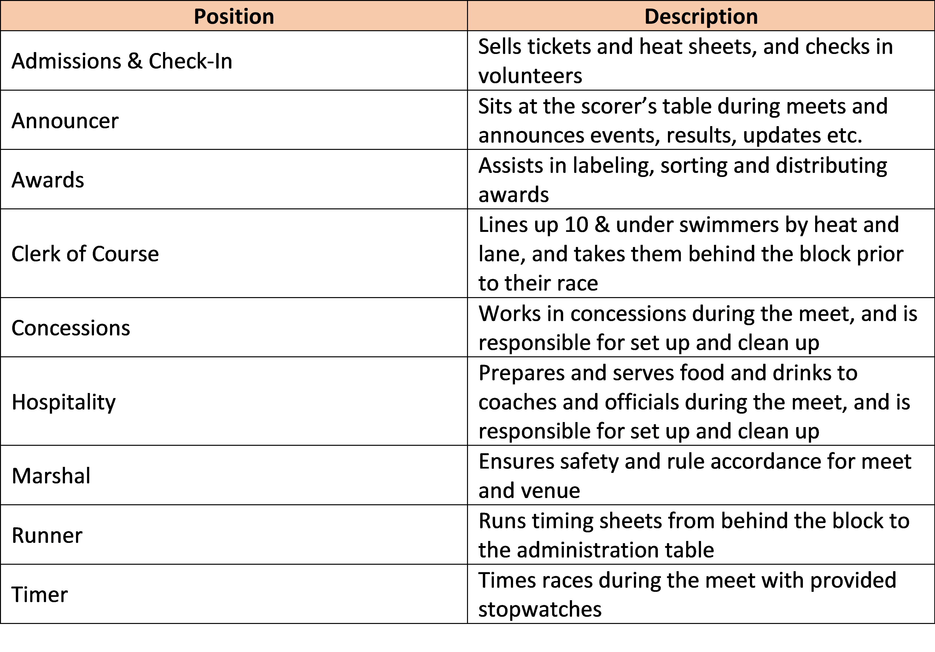 Parent involvement is the lifeline of a successful swim club. In order for our team to operate effectively and efficiently it takes a team effort. The biggest way for parents to help is at team hosted meets. Upon joining the competitive team, all families are required to fulfill session requirements at team hosted meets each season. Hosting a swim meet requires a large amount of help across various responsibilities, and there are several positions to help with.
