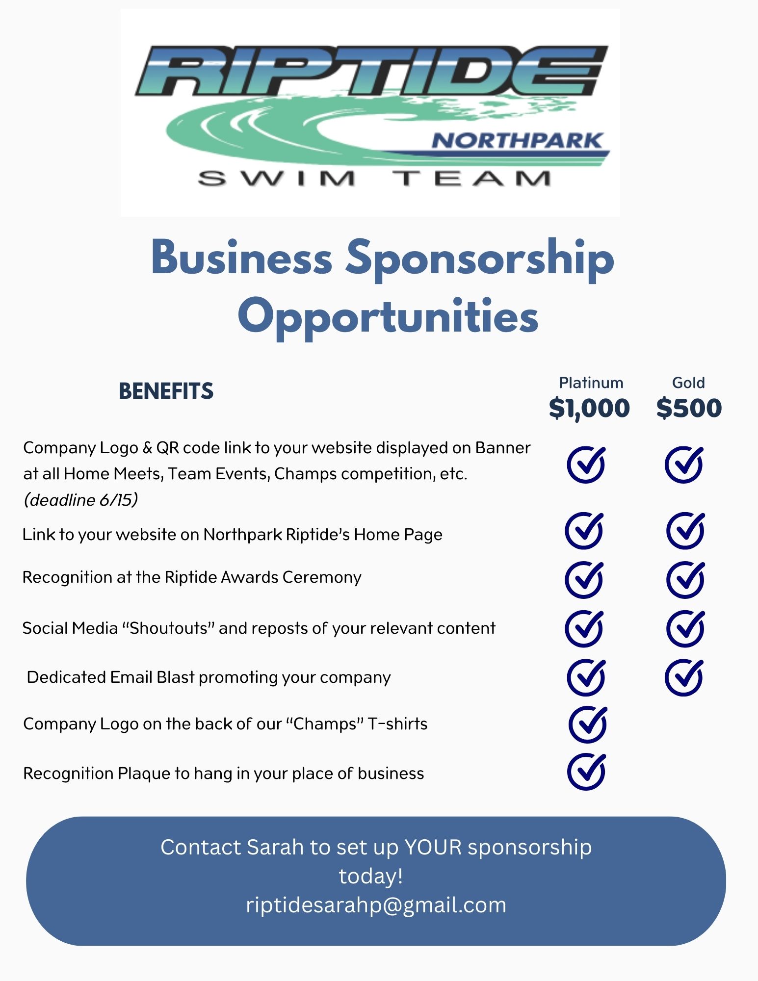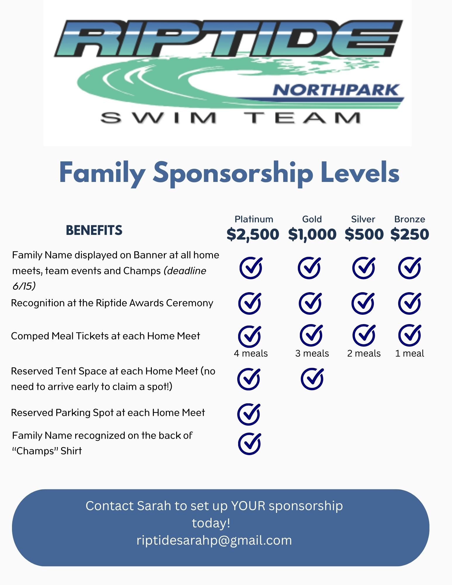 Your family or business can sponsor Riptide - ensuring our program can continue at the highest level - with a few perks for you!