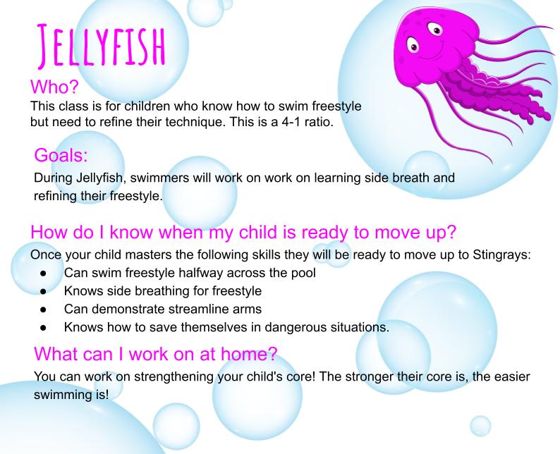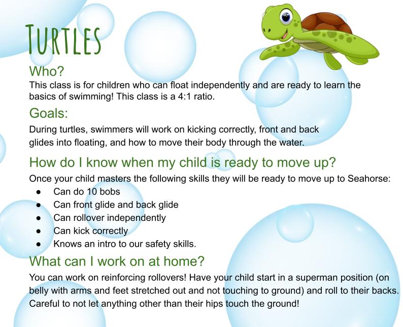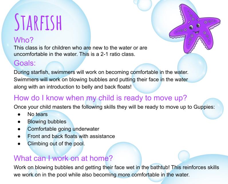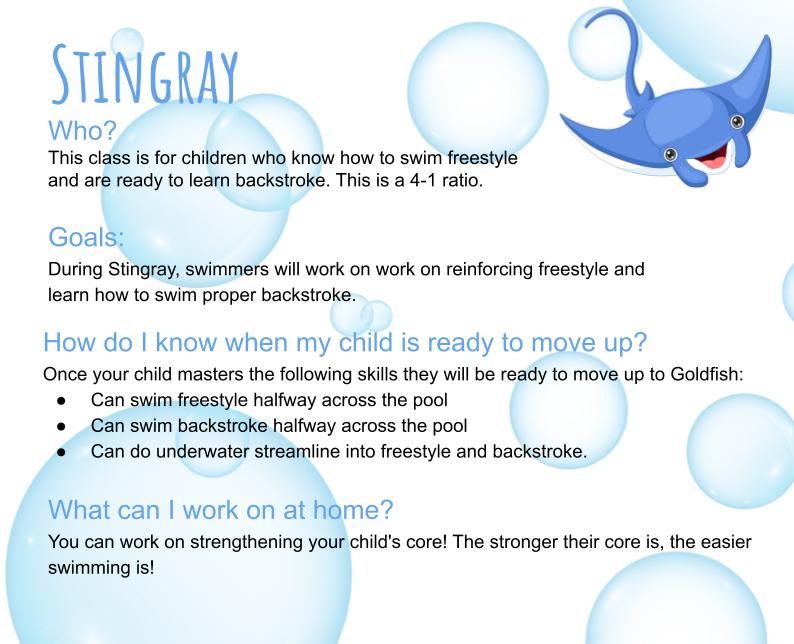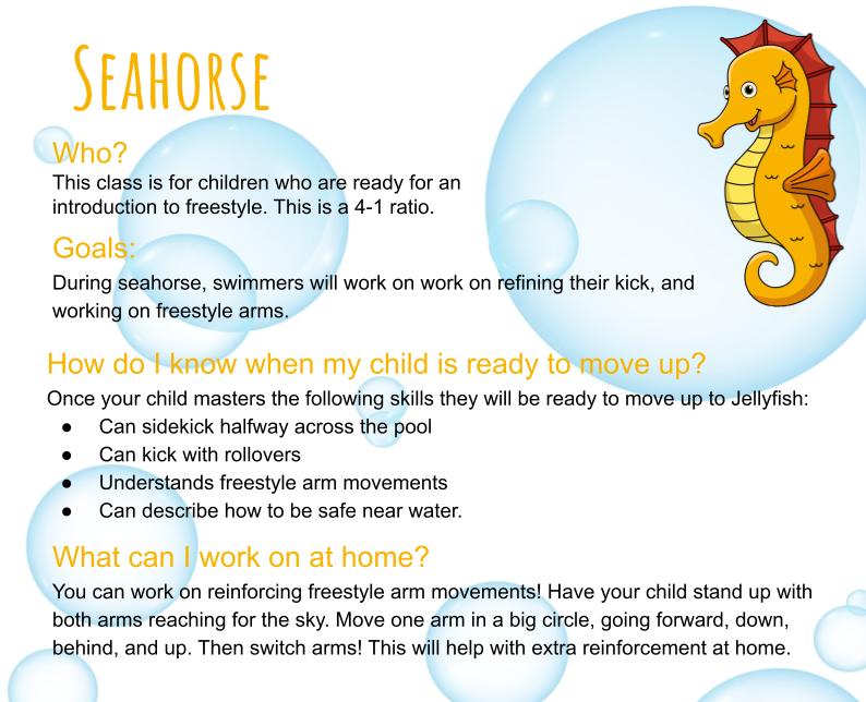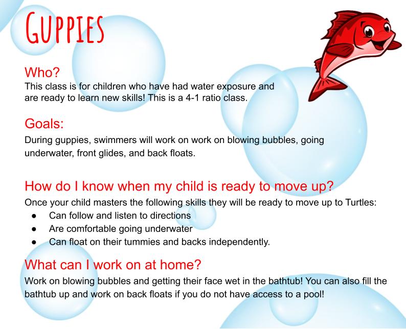Before the first swim lesson, students will be invited to a free swimming evaluation. This will help determine which course level best fits their needs. Check out our course levels: