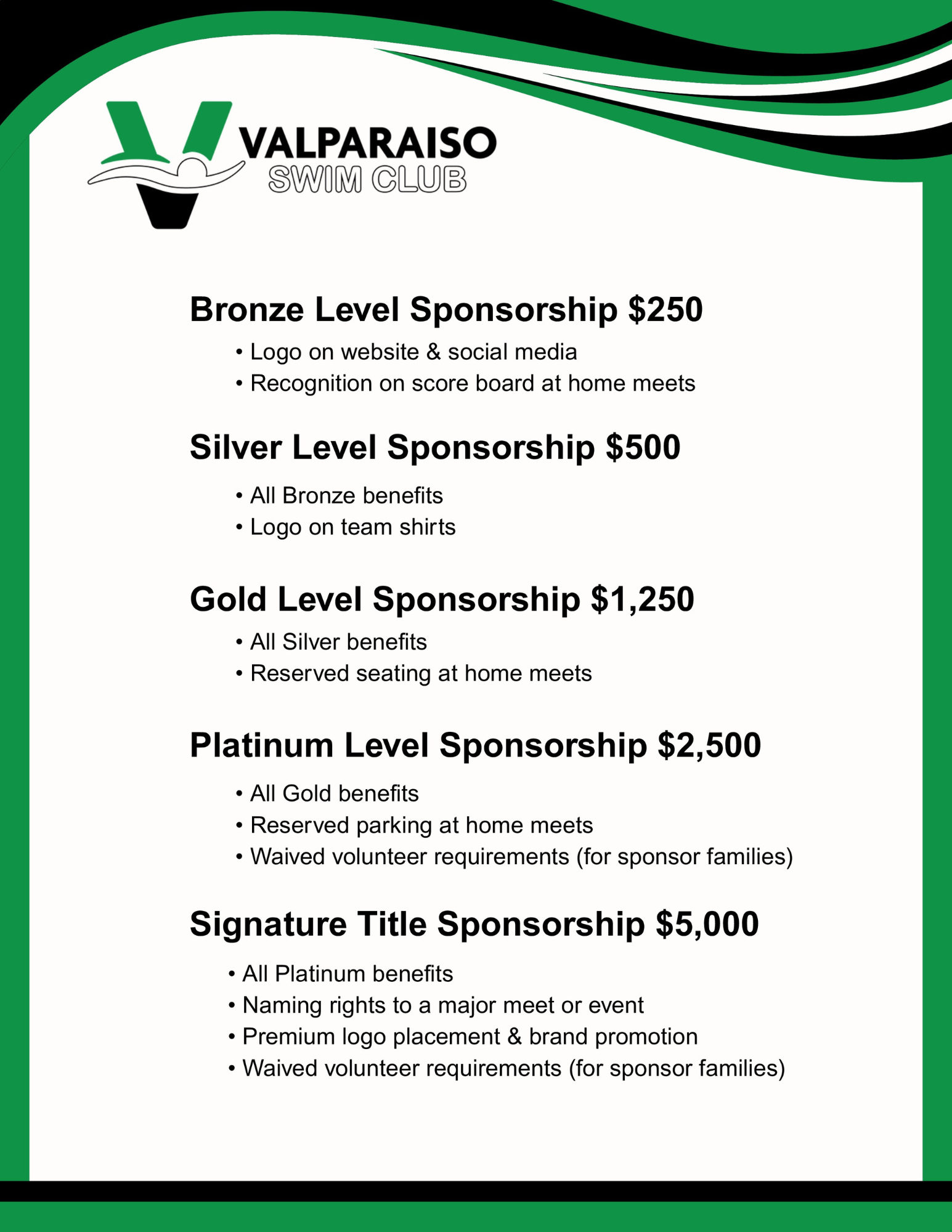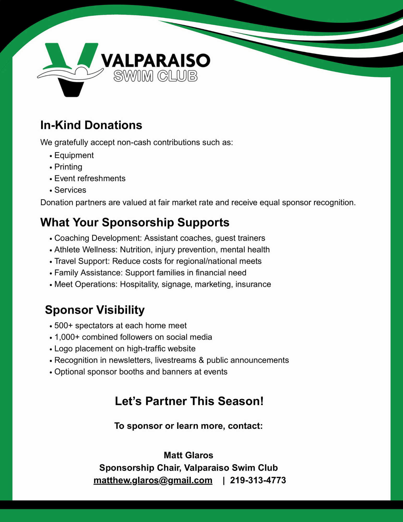 The Valparaiso Swim Club is proud to offer sponsorship opportunities that directly support our athletes and the future of competitive swimming in our community.