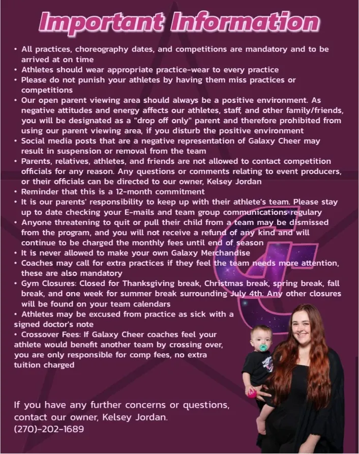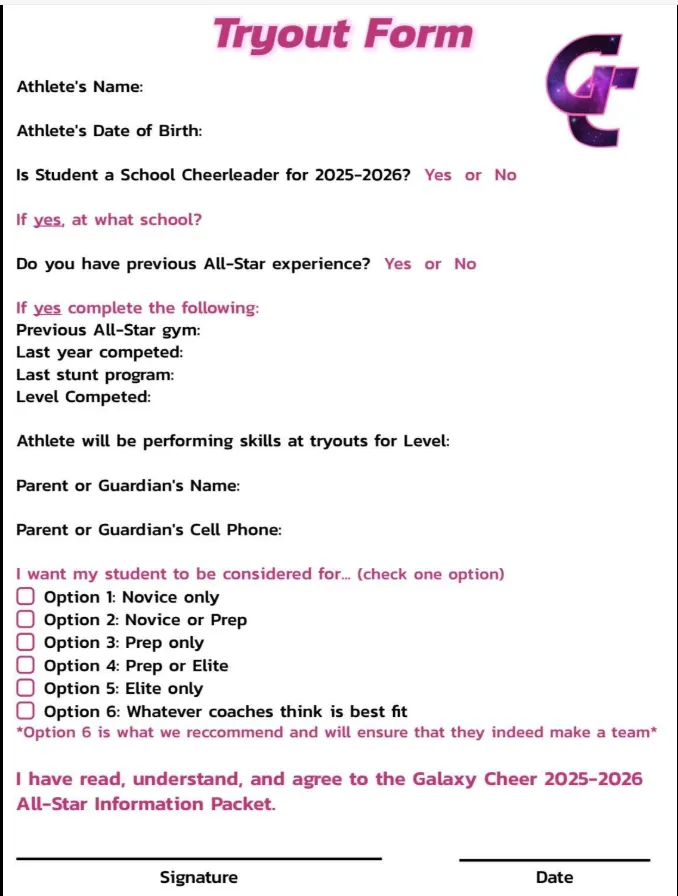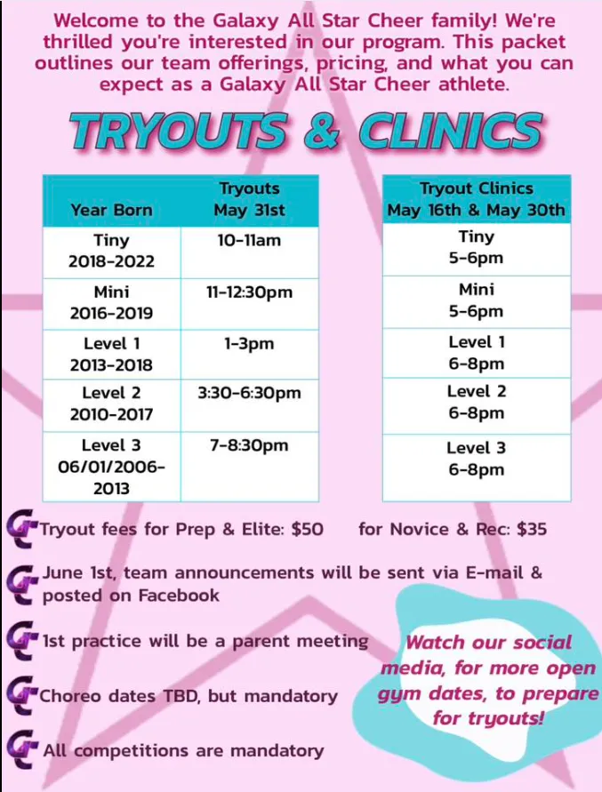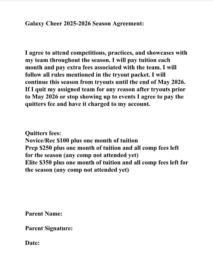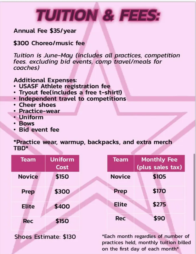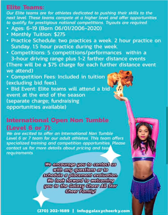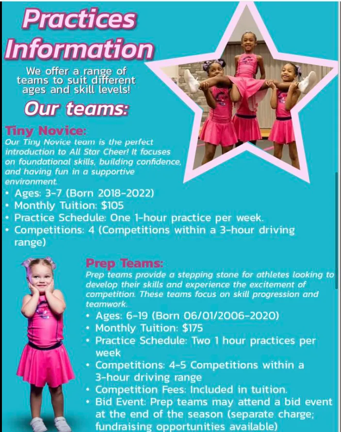 Elite teams will have practice once a week during the summer. Starting in August, a second practice will be added. Each practice will be 1.5 hours. Elite teams will attend 5 competitions within a 3-hour range, Atlanta Georgia Super Nationals, and one other event. Elite teams will attend a bid event at the end of the season. This will be a separate charge. (We will fundraise). Outside of bid fees, competition fees are included in tuition.