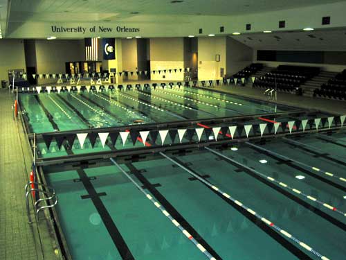 The UNO pool is a 50-meter indoor 8-lane pool with moveable bulkheads, bleacher seating, and fully automatic timing system with a state of the art video scoreboard, the UNO pool hosts major aquatic events such as the Sugar Bowl Swim Meet and the Louisiana High School State Championship Swim Meet.