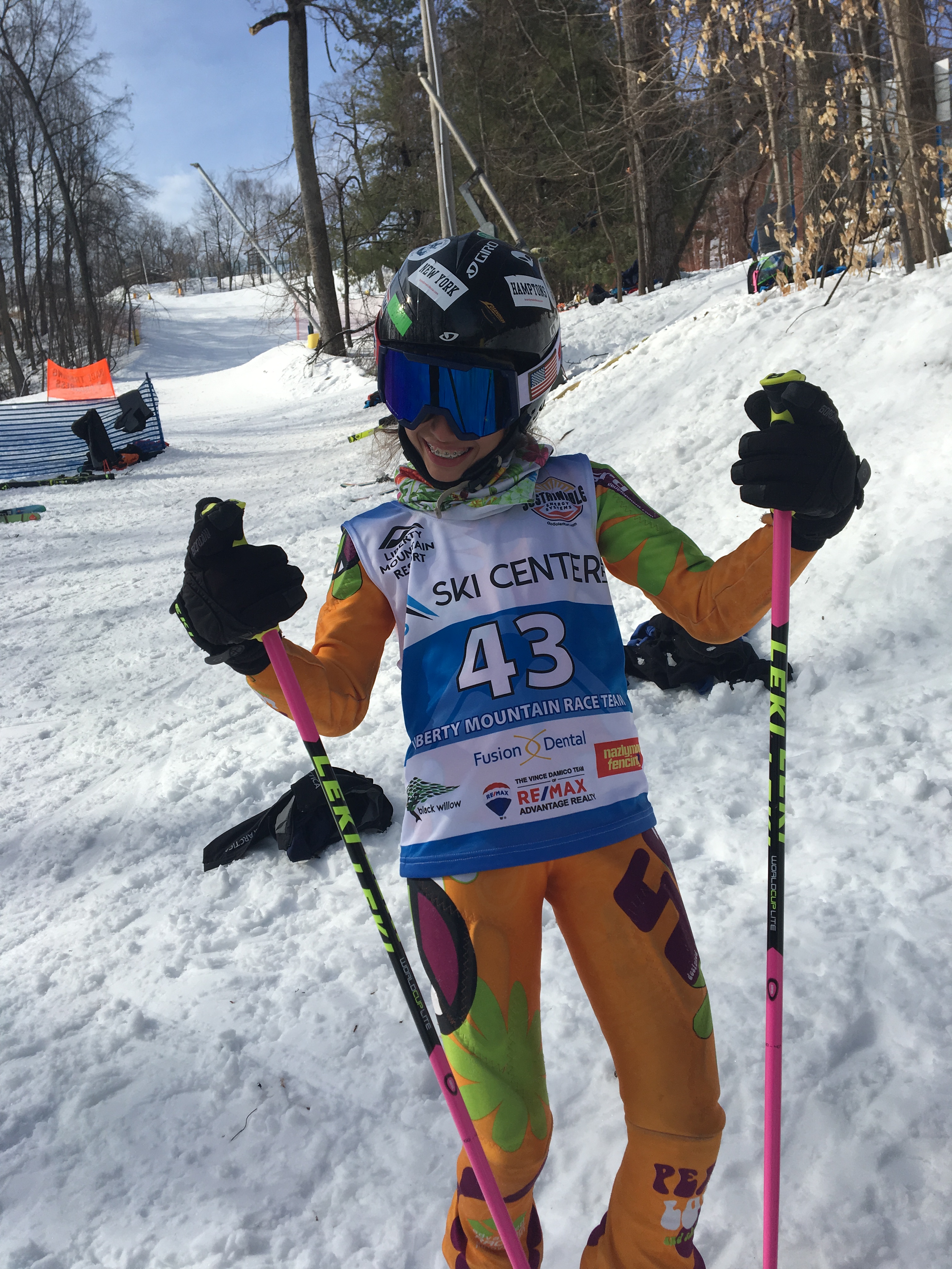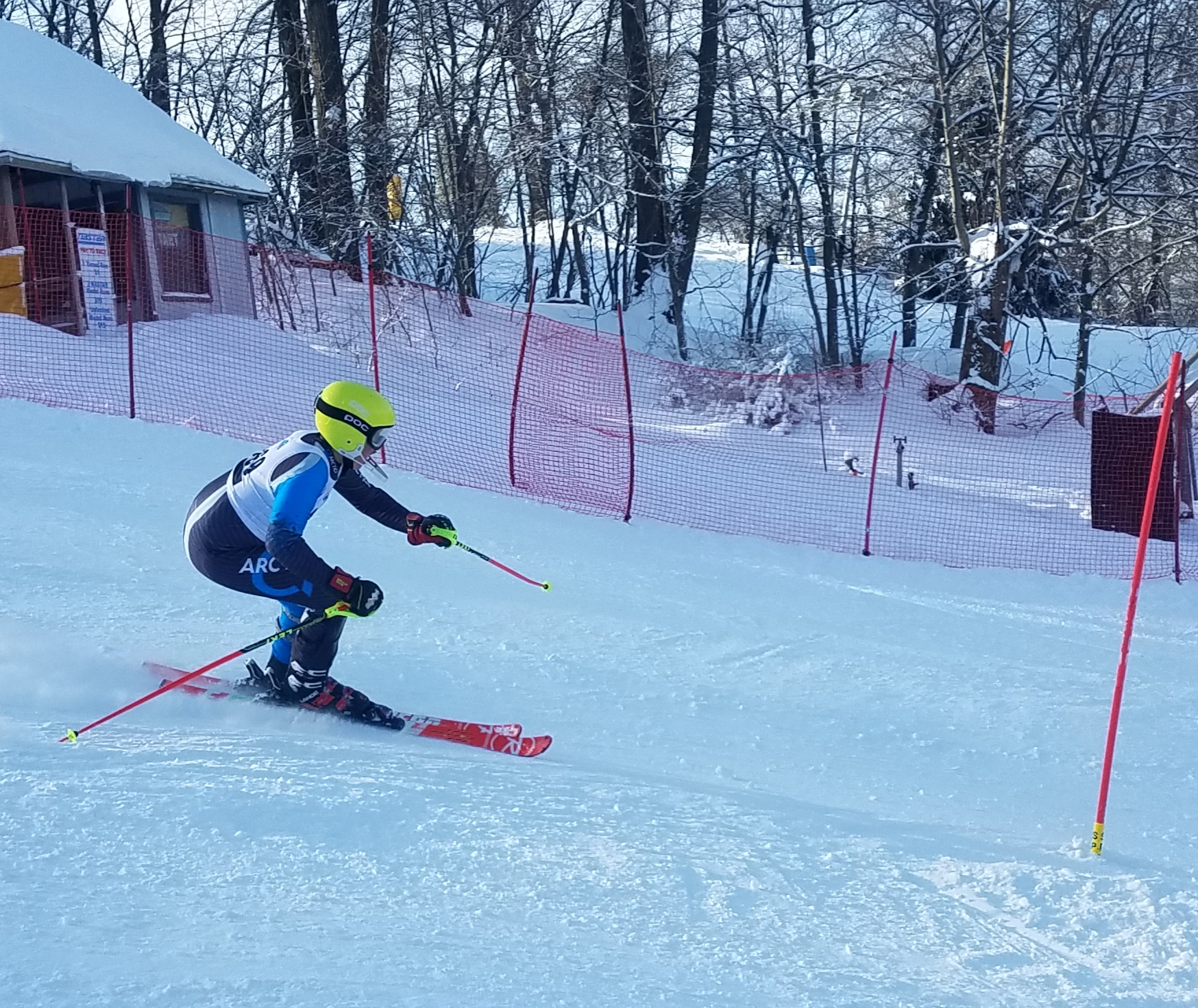 The U14 girls are a small group that holds fabulous skiers. Julietta Bravo (5), Hanna Rosenbloom (12) and Elizabeth “Bibs” Riddell (13) all looked great on the difficult course.