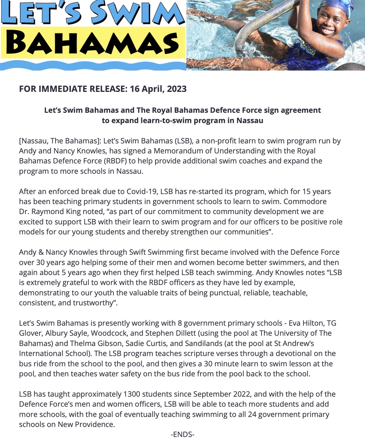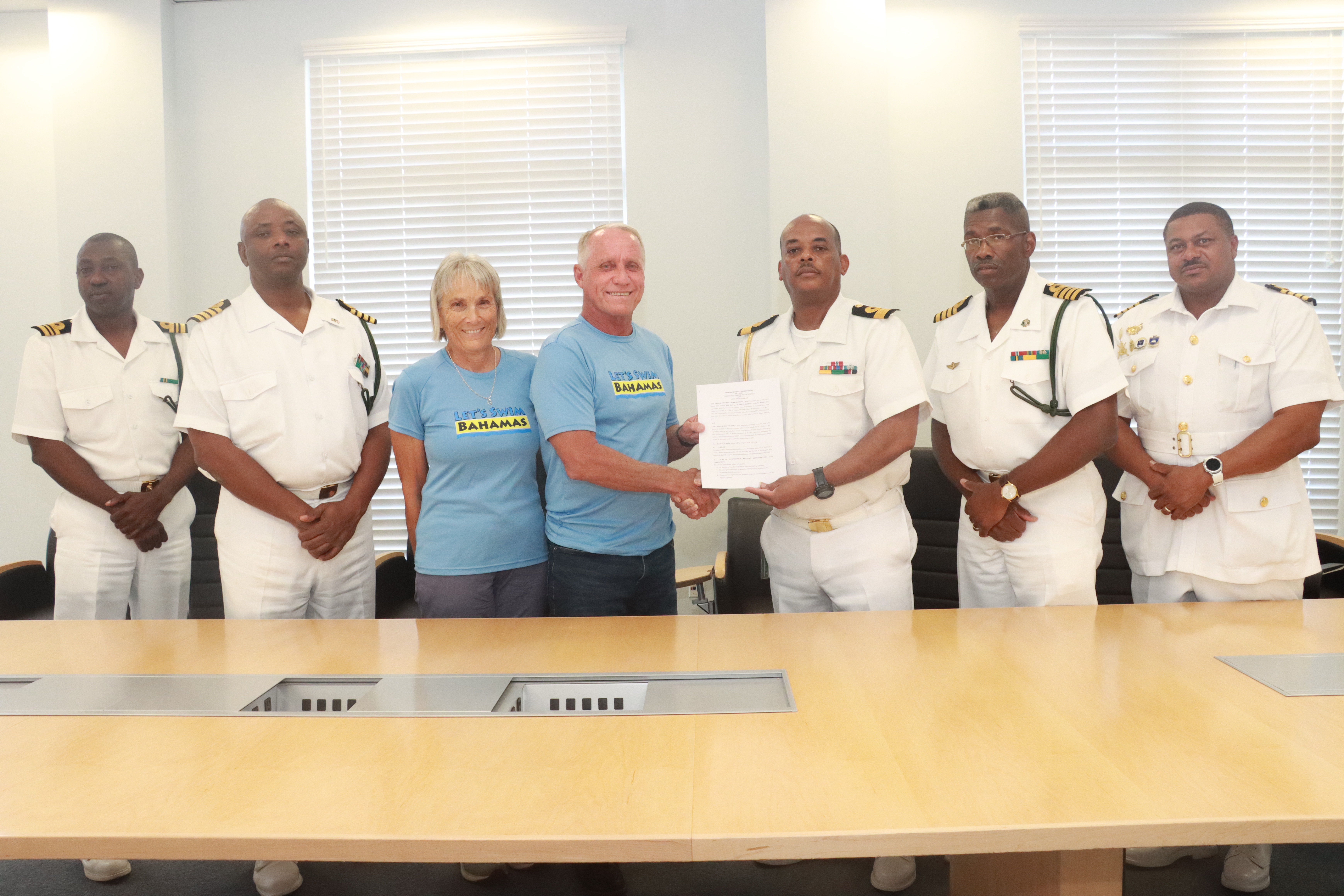 Commanding Officer Communications Branch, Captain Carlon Bethell; Deputy Commander Defence Force, Captain Shonedel Pinder; Commander Defence Force, Commodore Dr. Raymond King; Mr. Andy Knowles; Mrs. Nancy Knowles; Staff Officer Legal Affairs, Captain Shawn Adderley; and Commanding Officer Commando Squadron and Dive Officer, Lieutenant Commander Edward Fritz.