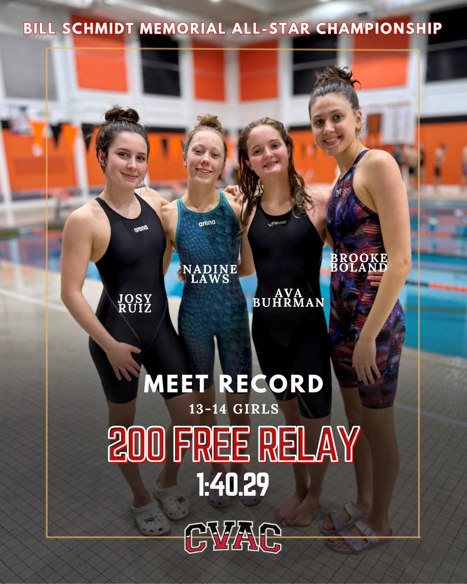 Squad of Nadine Laws, Brooke Boland, Josy Ruiz and Ava Buhrman broke the CPAL All-Star 13-14 Girls 200 Free Relay Record with a time of 1:40.29. Their splits of 25.92, 25.73, 24.90 and 23.74 respectively combined to overtake the 1:41.96 time posted by Lebanon YMCA in 1998 - 27 years ago.