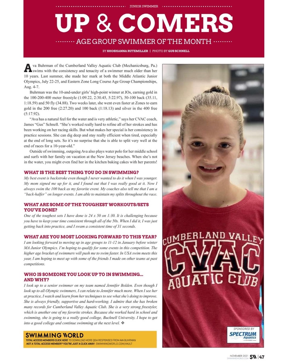 Coming off an incredible Summer where she won multiple events at the Eastern Zone Championship, 10 Year old Ava Buhrman is featured in the November 2021 Issue of Swimming World Magazine.
