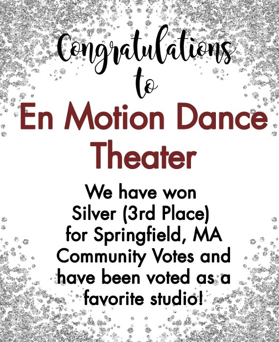 Congratulations En Motion! We have won Silver (3rd Place) for Springfield, MA Community Votes! Because of you and our supporters we have been voted as a favorite dance studio in the area! Thank you and this is a great start to out 28th year of dance!!