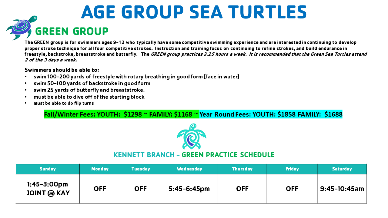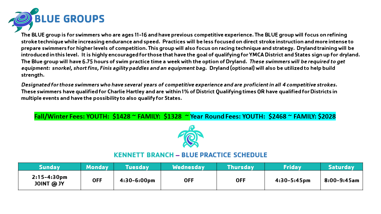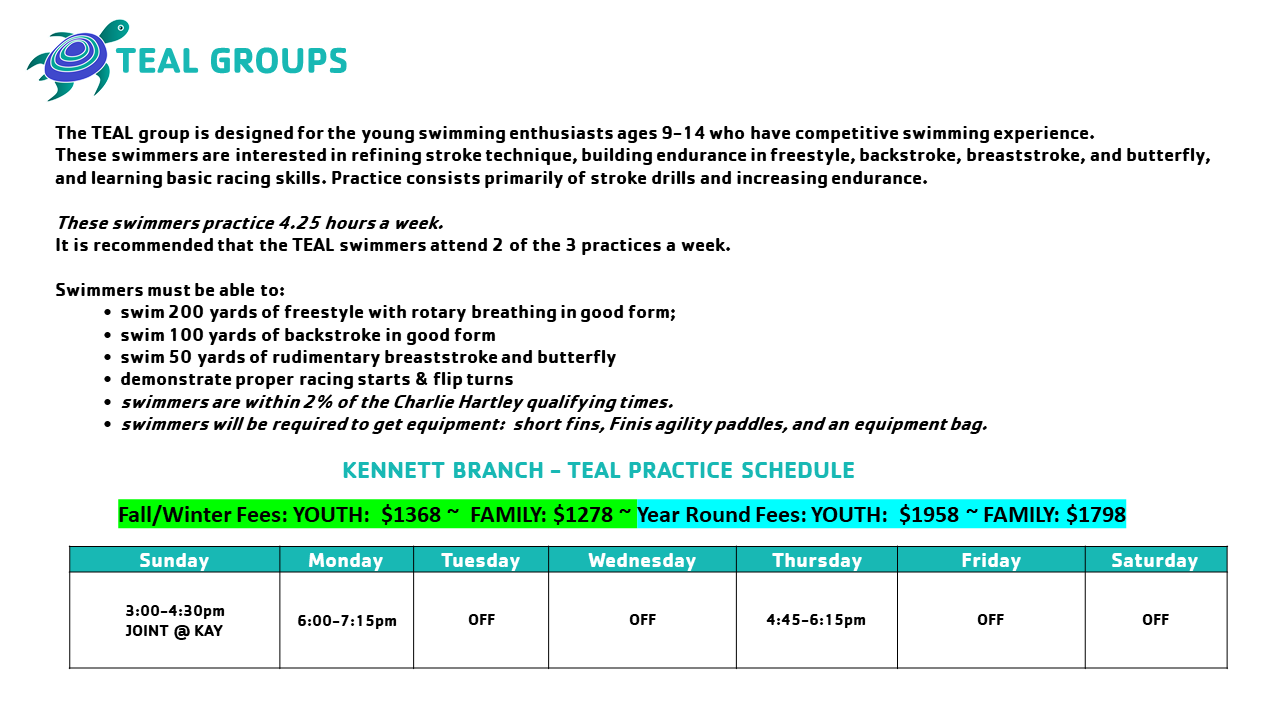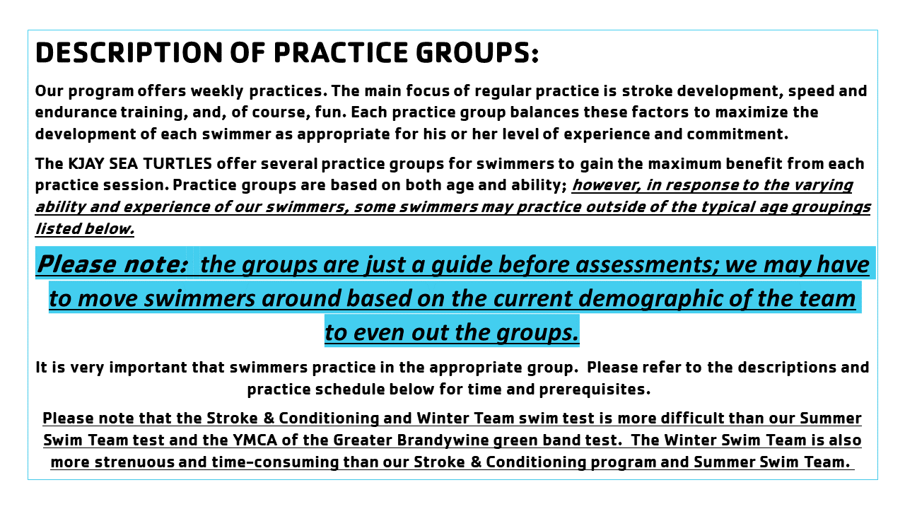 Please note: the groups are just a guide prior to evaluations, we may have to move swimmers around based on the current demographic of the team to even out groups.