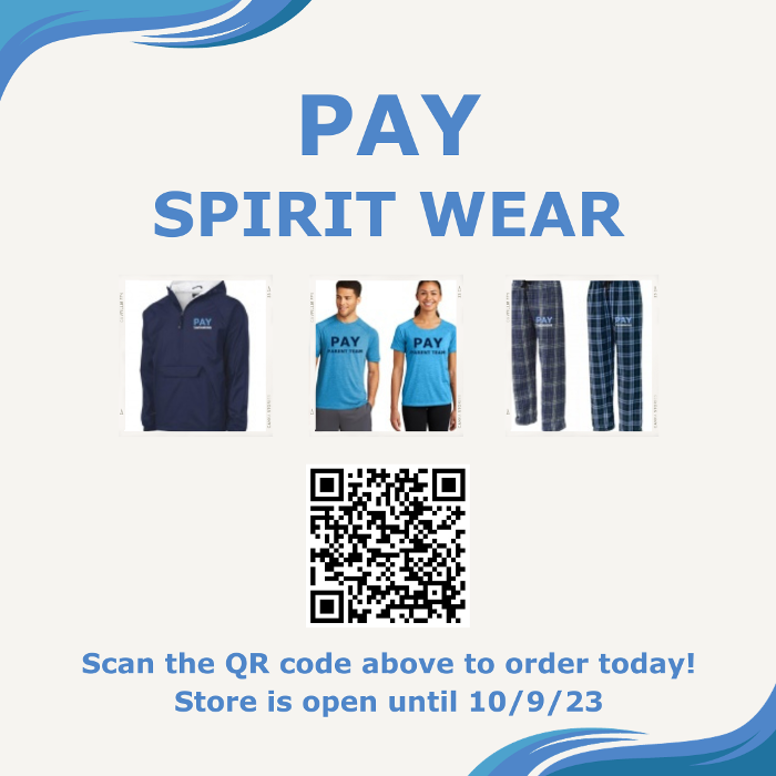 SPIRIT WEAR APPAREL ORDERS- The deadline to order PAY Spiritwear apparel has been extended to Oct 9th. Please see the attached bulletin for a QR code for more info and for ordering.
