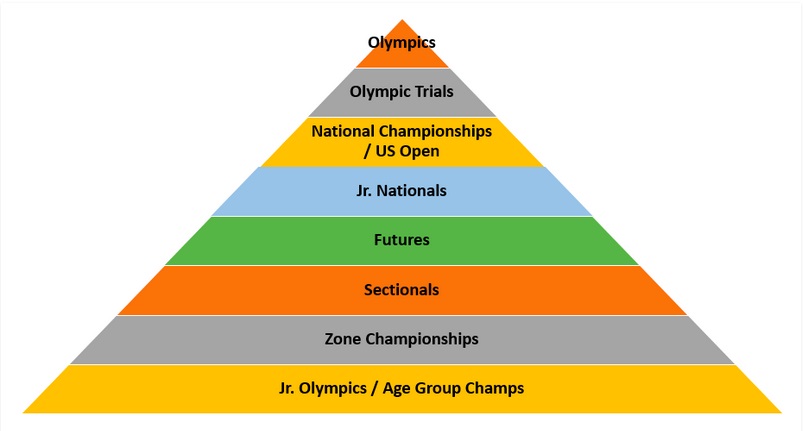 A swimmer's USA Swimming path begins at local level meets and can move to tri-state area Junior Olympics (JOs) meet, then progresses to Zones and Sectionals, and then moves onto the “national” stage of Futures then Junior Nationals Championships. The graphic above summarizes the overall path to the top