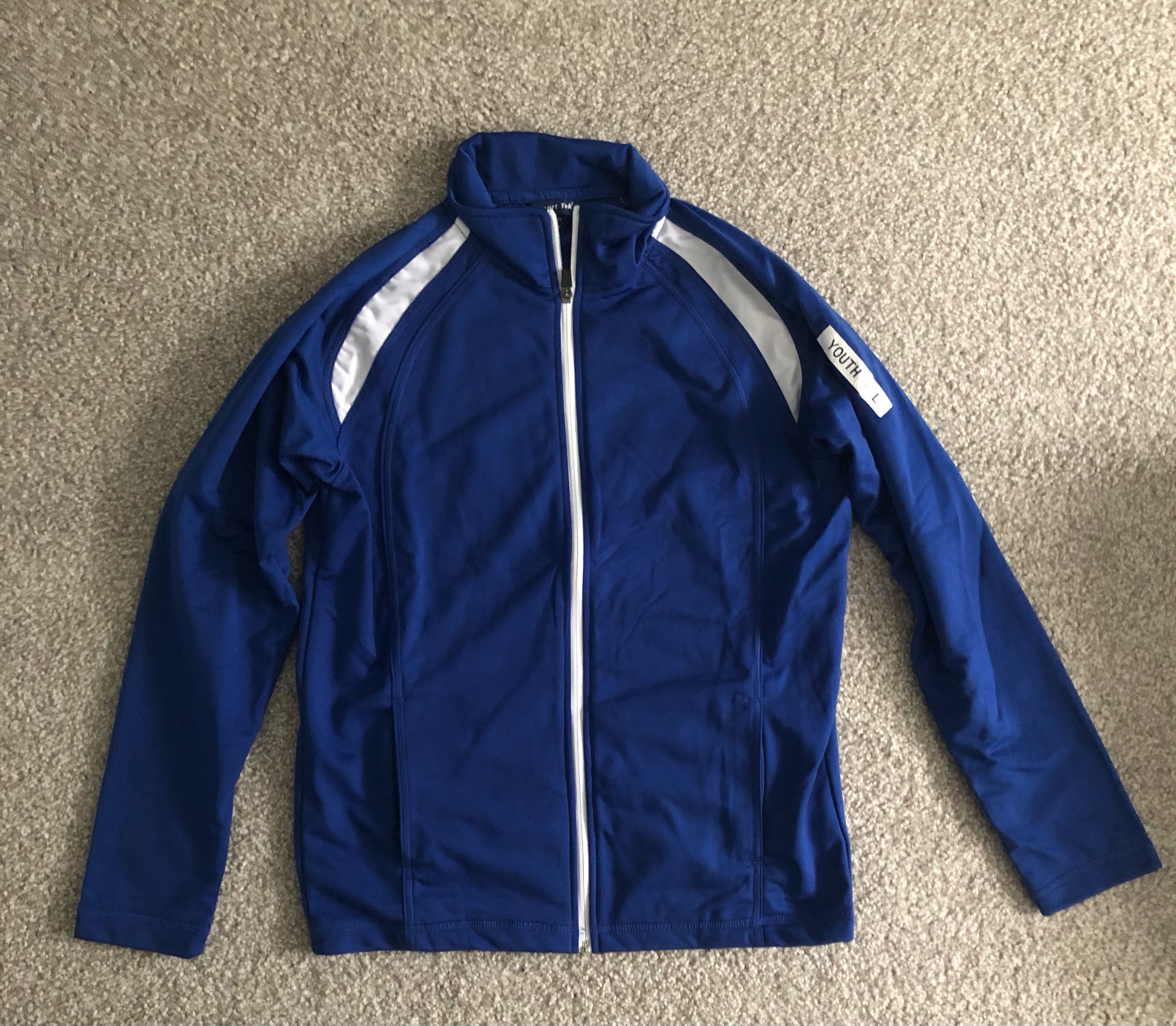 Royal blue full zip warm up jacket without embroidery. Cost: $30 each.