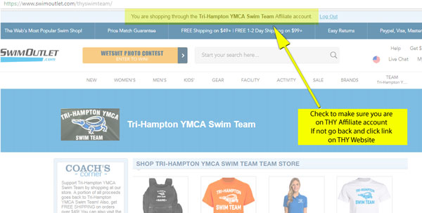 In order for THY to earn a portion of your purchases please be sure that "You are shopping through the THY Swim Team Affiliate account" is listed on the top of the page.
