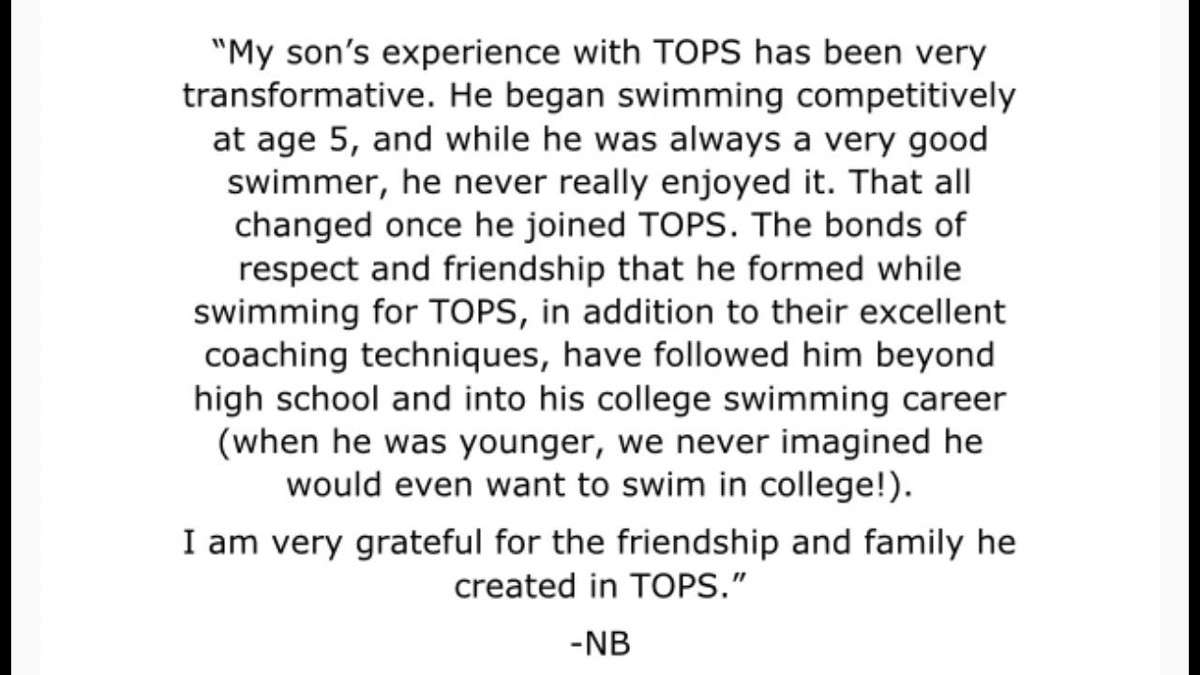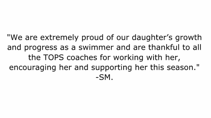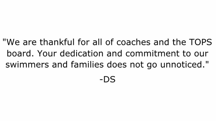 SUPPORT - TOPS coaches will support our swimmers through honest feedback, assessment, and attendance to issues pertinent to the swimmer. TOPS swimmers and parents, are expected to lend their support, in words and actions, at practice and meets.