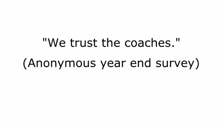 TRUST - TOPS swimmers and parents can trust that the coaches will provide a safe and productive training environment that will foster personal growth for each swimmer. TOPS coaches trust that swimmers, and parents, will care about others, through word and action, when representing TOPS.