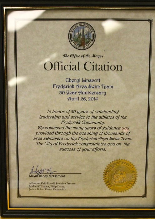 Frederick, MD— In honor of 30 years of outstanding leadership and service to the athletes of the Frederick community, Mayor Randy McClement commended the many years of guidance Coach Cheryl Linscott has provided through the coaching of thousands of area swimmers on the Frederick Area Swim Team. The City of Frederick congratulated Coach Cheryl on the success of her efforts with the attached Official Citation.