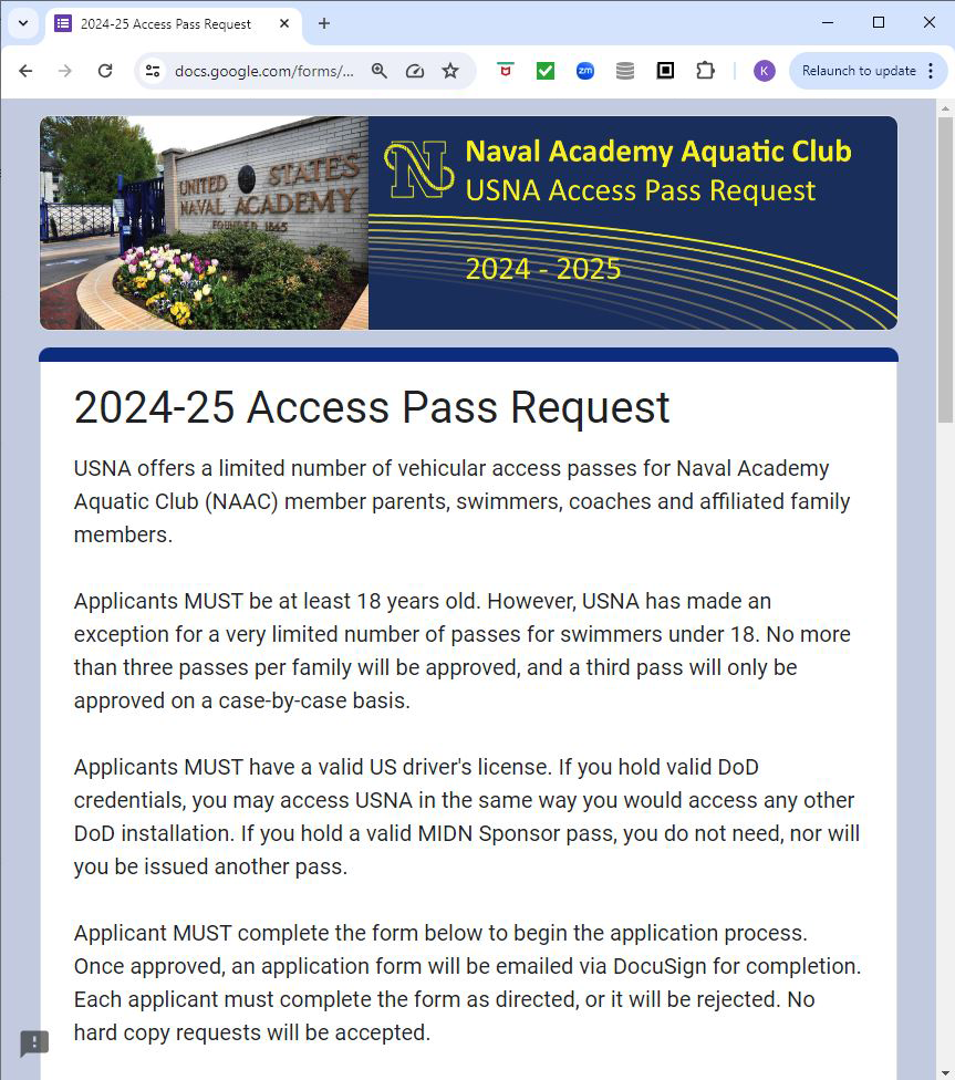 USNA offers a limited number of access passes to the USNA for club practices and events throughout the year for the use of NAAC parents, guardians and coaches. All applicants MUST have a valid US driver's license.