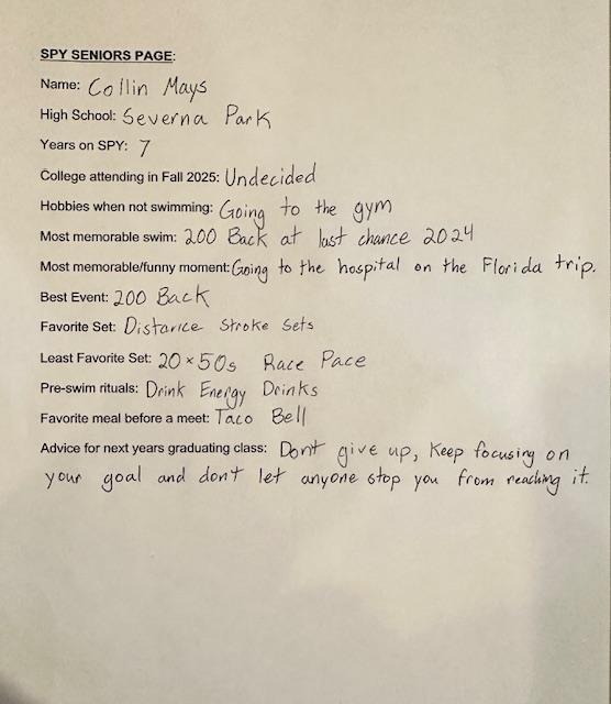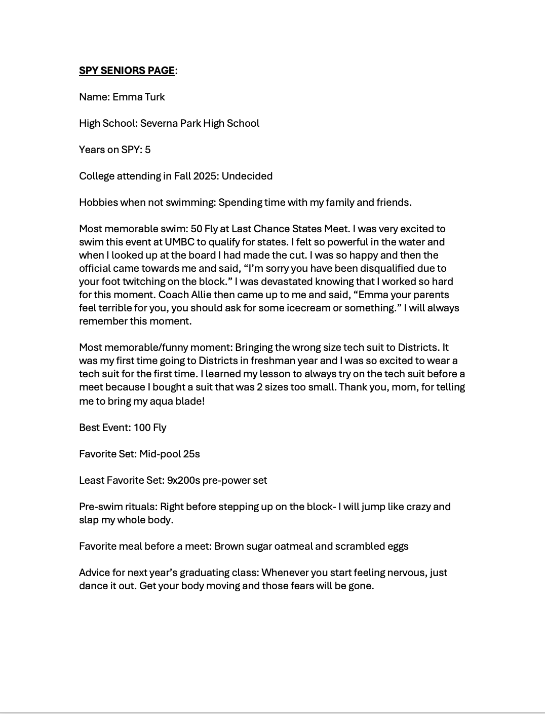 Natalie Frank - When you look back on your time in SPY, you won’t remember the races you added time on or the challenging sets you struggled to get through. Instead, you will remember the amazing people you met and the memories you made. So always have fun, show up to practice, and savor every moment!