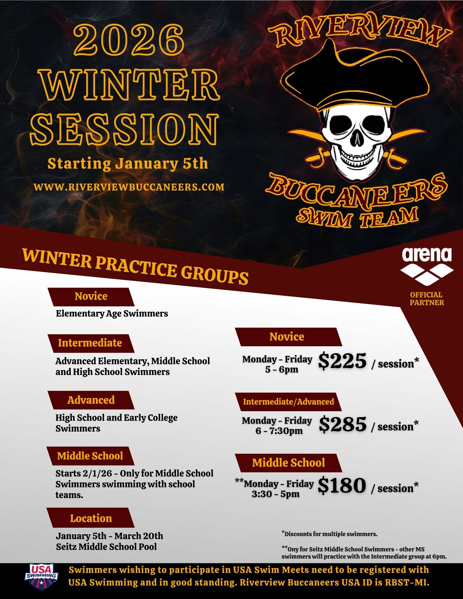 Middle school swimmers are eligible to join on February 1st but must sign up during the registration period. Please take note of your practice times.