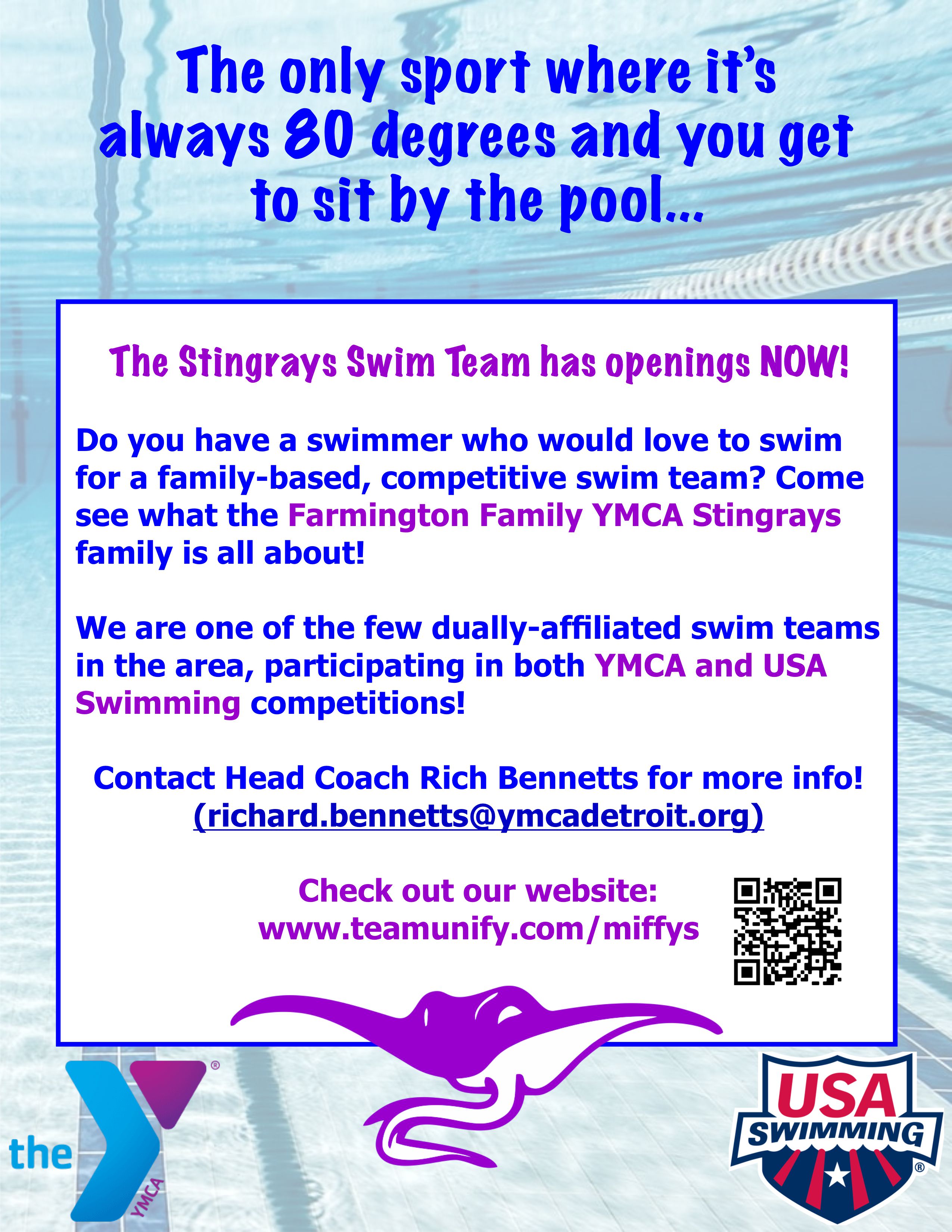 We are officially into October and in swimming that means one thing: swim meets! We have our first YMCA "team effort" meet on October 28-29 at Lake Orion High School. The meet packet is out and will be available to you soon. Coach Rich STRONGLY encourages all swimmers to sign up for this meet! If you have questions as to what events to put your swimmer in, please talk to the coaches before or after practice, or email Coach Rich at [email protected].