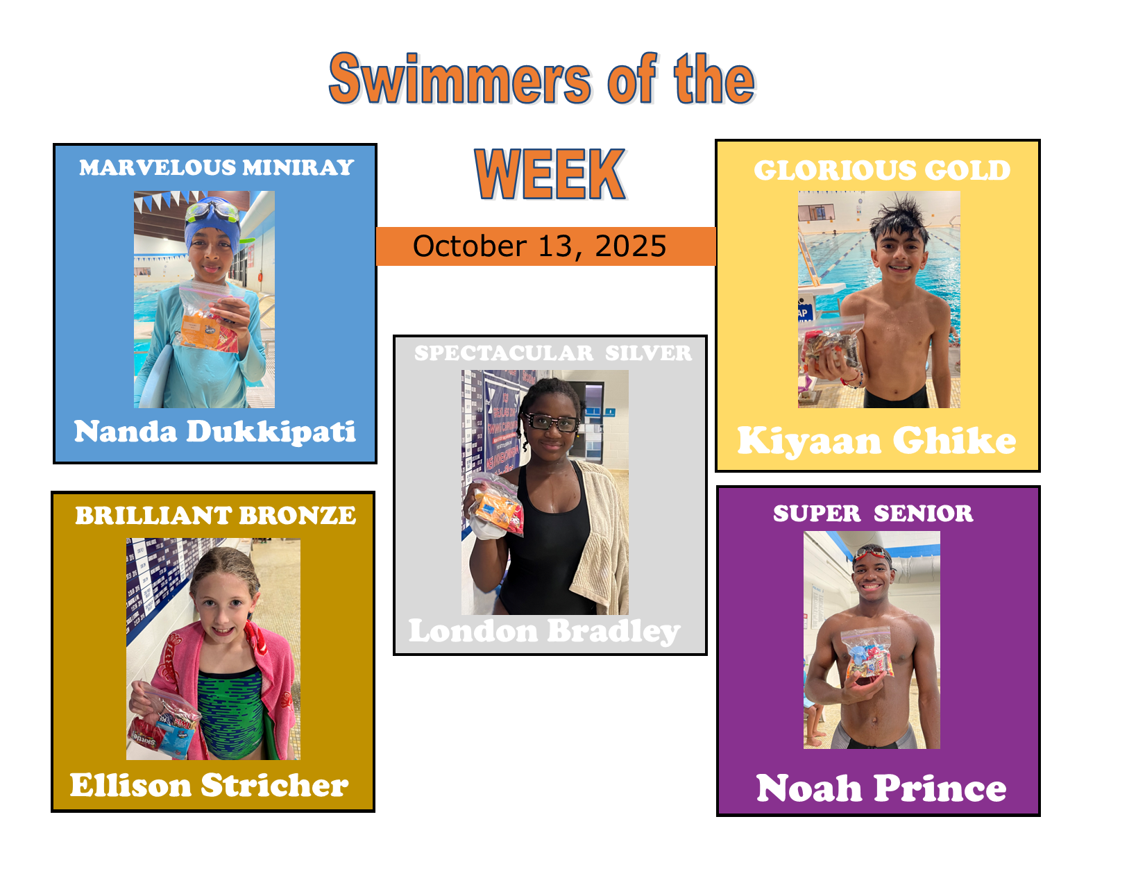 Each week, our coaches choose one swimmer from each practice group to recognize. It could be for working hard, being a great listener, showing improvement, being a good teammate, showing good sportsmanship, swimming well at a meet, or anything else that the coaches want to consider.