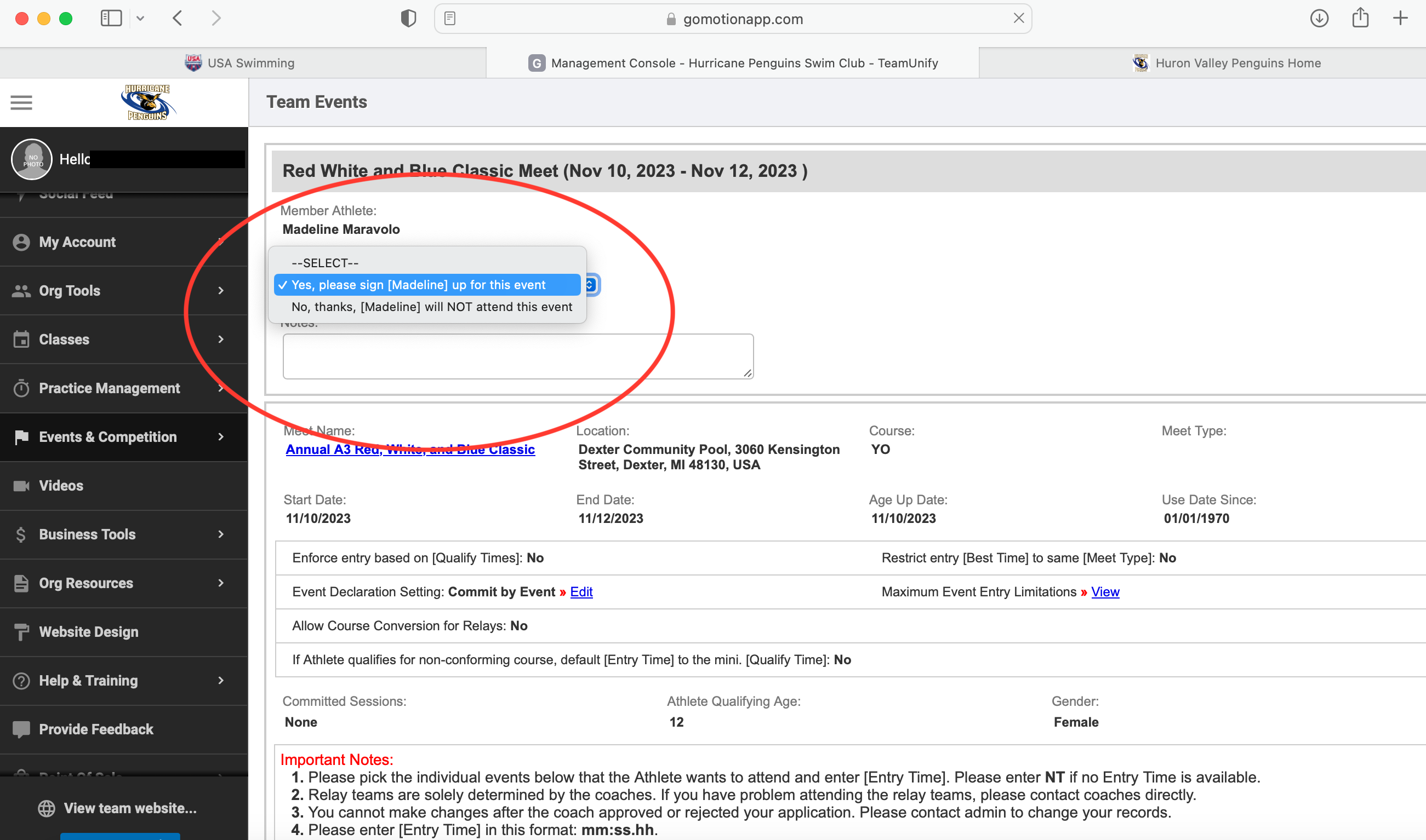 4. Select whether your swimmer will be attending, or not attending the meet. Use the notes section to inform the coach of anything you'd like them to be aware of such as your swimmer is only able to swim one particular day of the full weekend.