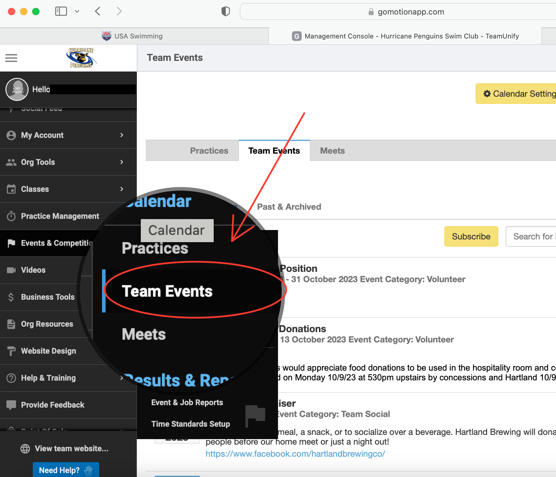 2. Locate the side bar labled "Events & Competition" and select "Team Events"