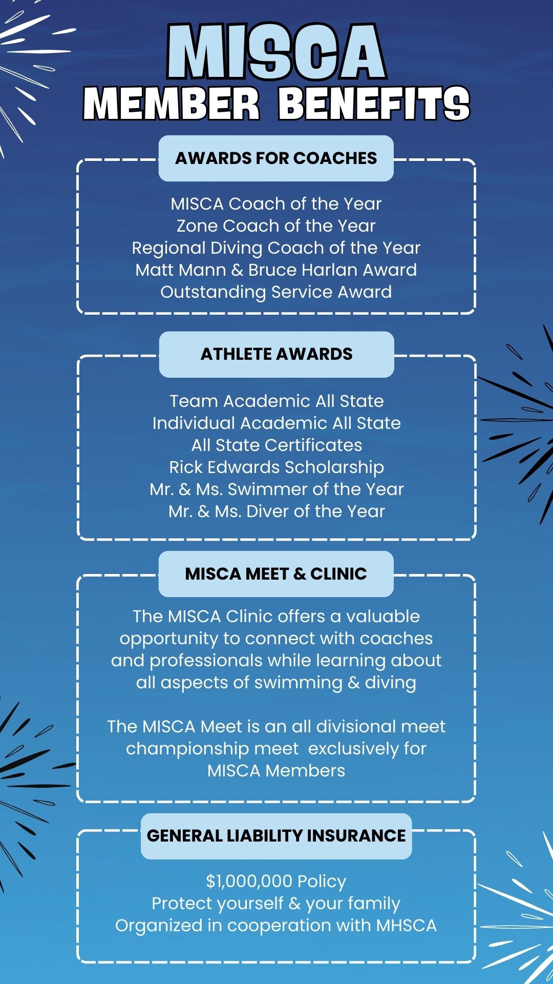 MISCA is the professional organization serving Michigan’s high school and Middle school coaches in competitive swimming and diving. MISCA works closely with the Michigan High School Athletic Association in all aspects of aquatics including rule revisions, establishing qualifying times for the state championships, and representation on the MHSAA Athletic Council.