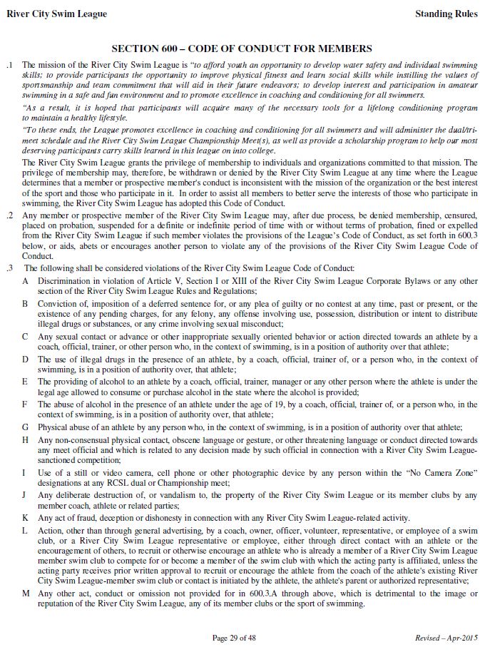 The Mandarin Kraken Swim Club will follow the Code of Conduct for Members as set forth by the River City Swim League Standing Rules, Section 600, a copy of which is below.