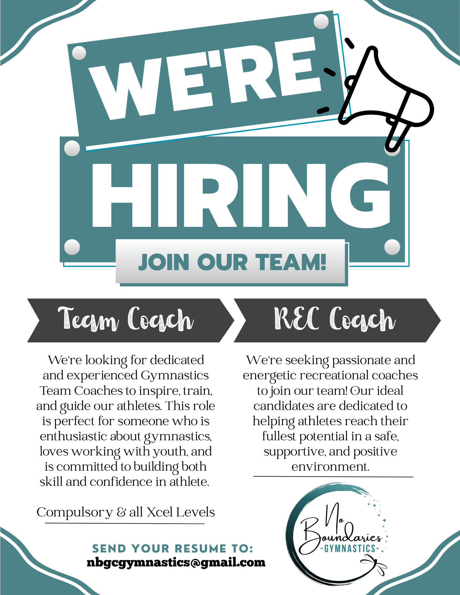 No Boundaries Gymnastics Club is on the lookout for potential employees. Don't hesitate to apply if you are energetic, reliable, and enjoy working with children and have a passion for gymnastics!