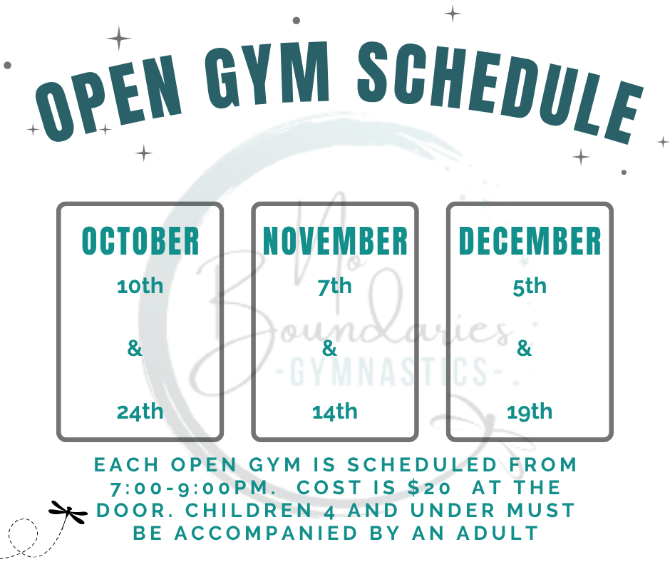 **Please make note of dates that open gym will be replaced by Parents Night Out! For details on those events, please visit our SPECIAL EVENTS tab and select PARENTS NIGHT OUT!