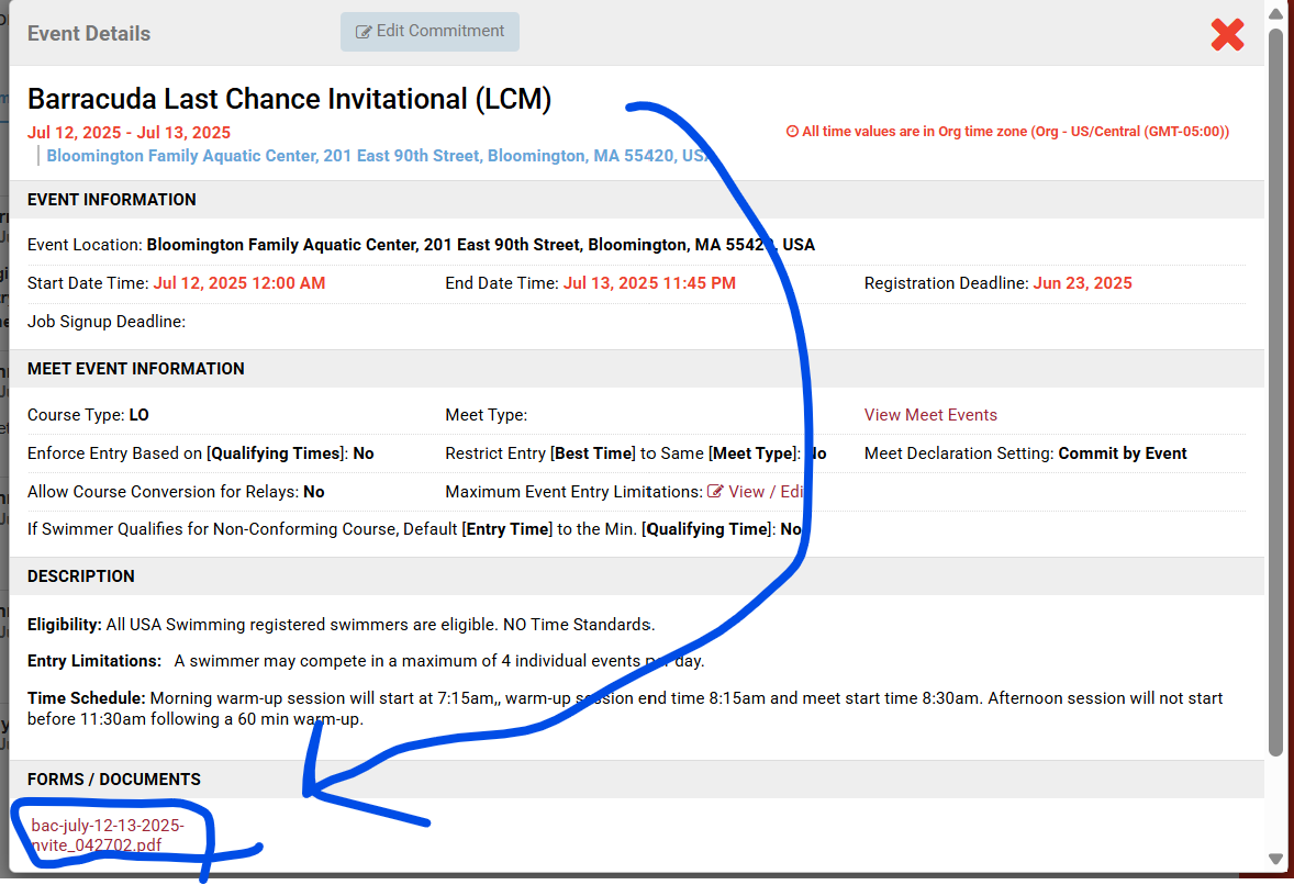 NOTE: for Multi-Day meets - you will need to ensure you know what time EACH DAY your swimmer is competing. Events will be spread out over the course of several days.