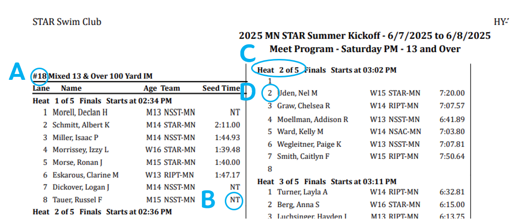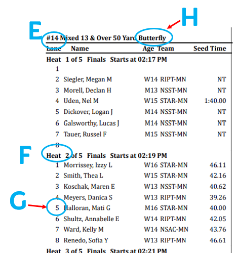 1. It is important for any swimmer to know what event numbers he or she is swimming. The swimmers may swim right away after the warm-up or they may have to wait a while. This is why is it helpful for swimmers to have a copy of the Heat Sheets for themselves. Being prepared is the best way to alleviate nerves and anxiety!