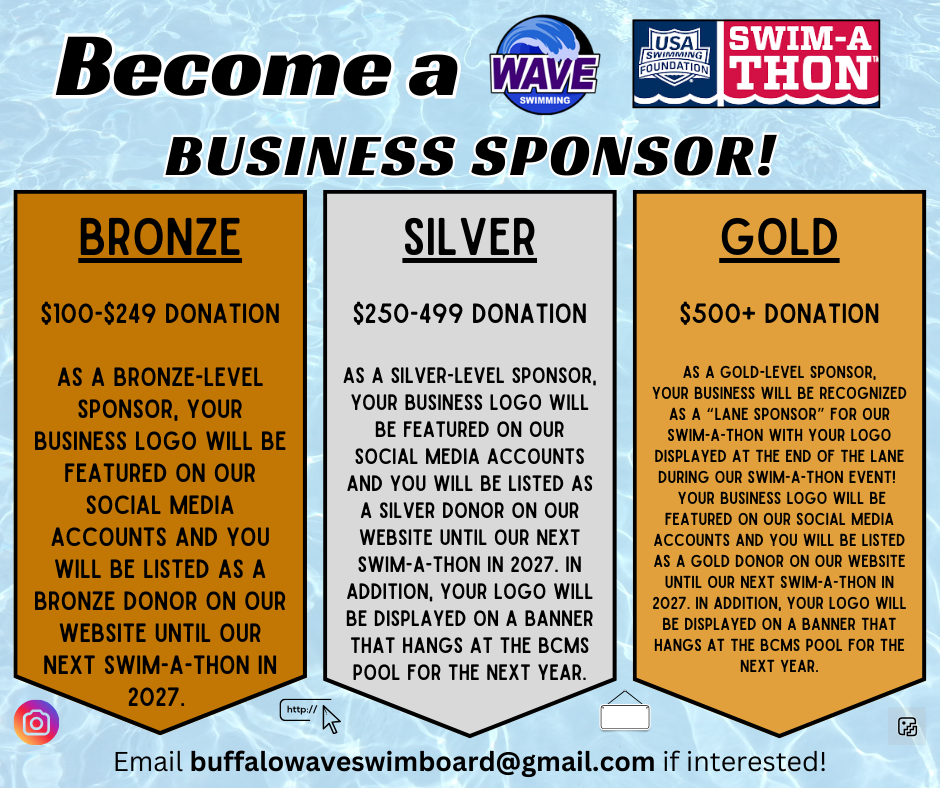 Wave Swim Club is a non-profit, 501c(3) organization. Our club is always accepting monetary donations and can provide a donation receipt if needed. Cash or checks payable to Wave Swim Club are accepted. Past monetary donations have been used to purchase a new laser printer and ink and toner cartridges to use for hosted swim meets, snacks for championship level meets for swimmers, swim caps, goggles, etc.