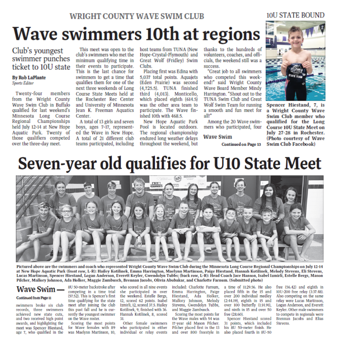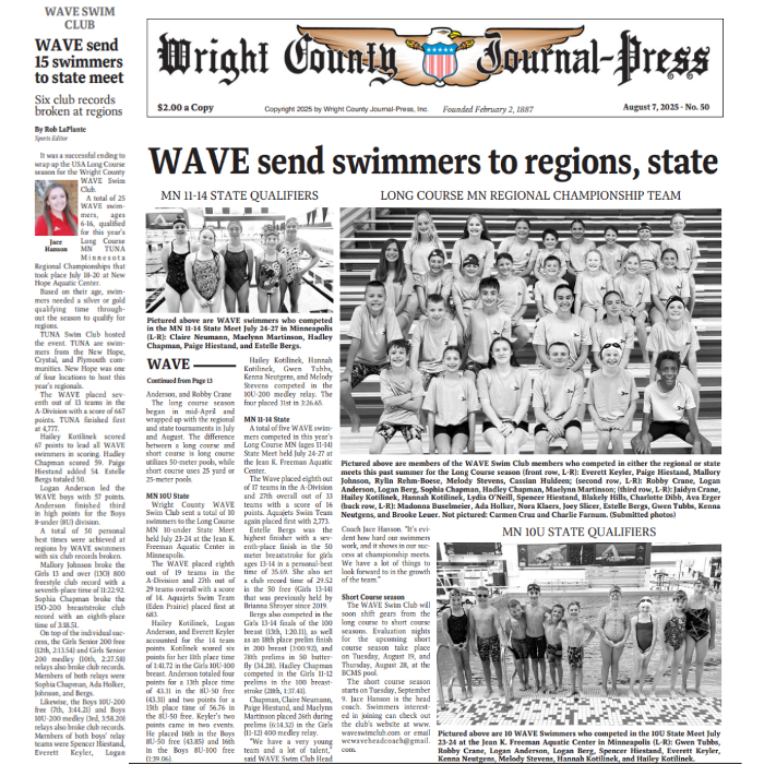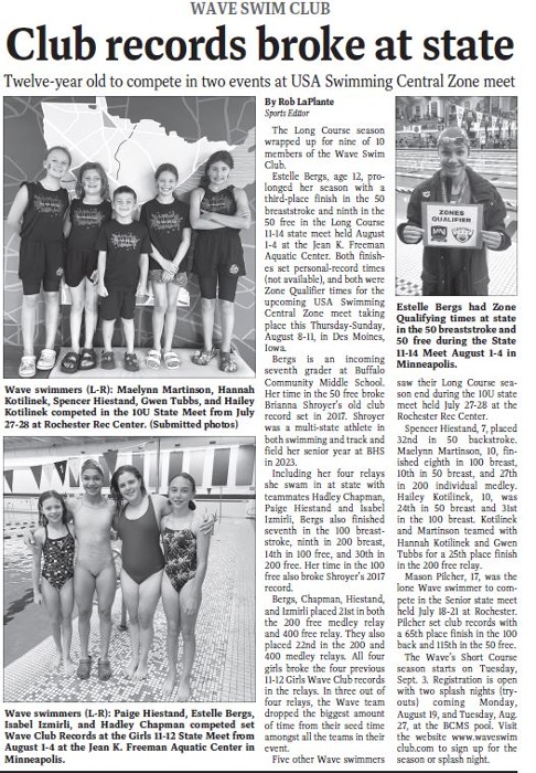 Wright County Wave Swim Club is a non-profit year-round, competitive swim team offering high-quality professional coaching and technique for swimmers at every age and ability. Training groups are designed based on an age-appropriate training progression and each group is under the direction of a USA Swimming Certified Coach. All training groups practice at the Buffalo Community Middle School Pool.