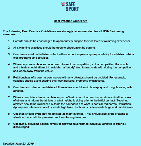 - Report a Safe Sport Concern: www.usaswimming.org