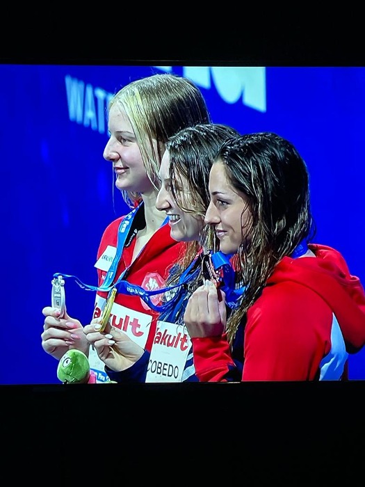 Emily swam into a 2:17.85 this morning, BARELY edging out Olympian Evgeniia Chikunova to take the Gold Medal in the 200M Breaststroke. The difference between Gold and Silver was a mere .03 seconds, with Emily closing the race with an incredible :36.00 split for the win.
