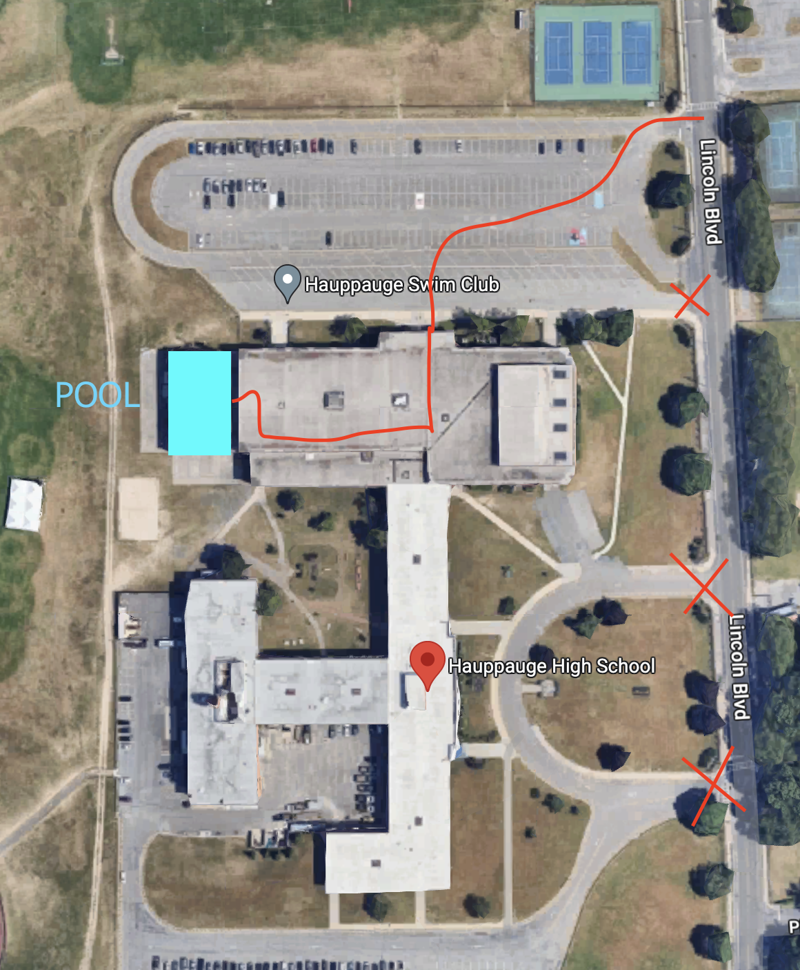 - The pool is located in the north parking lot. This is the parking lot with the traffic lights by the tennis courts. We are not at the main entrance in the front of the building with the circle. With the map below, please enter the building with the larger set of doors. The entrance has the pool entrance sign is often locked due to school safety.