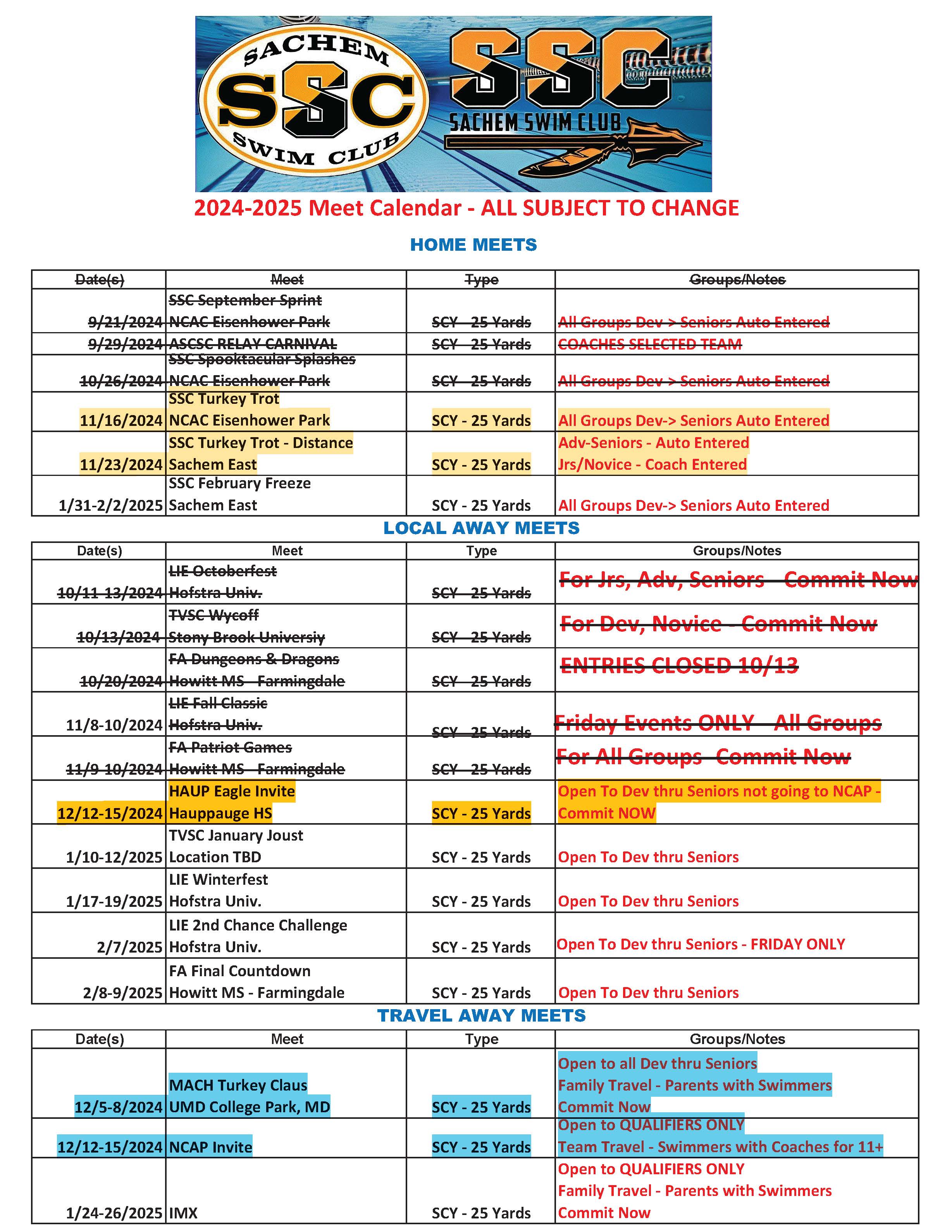Please see the updated Meet Calendar. Please commit to YELLOW and BLUE highlighted meets ASAP.