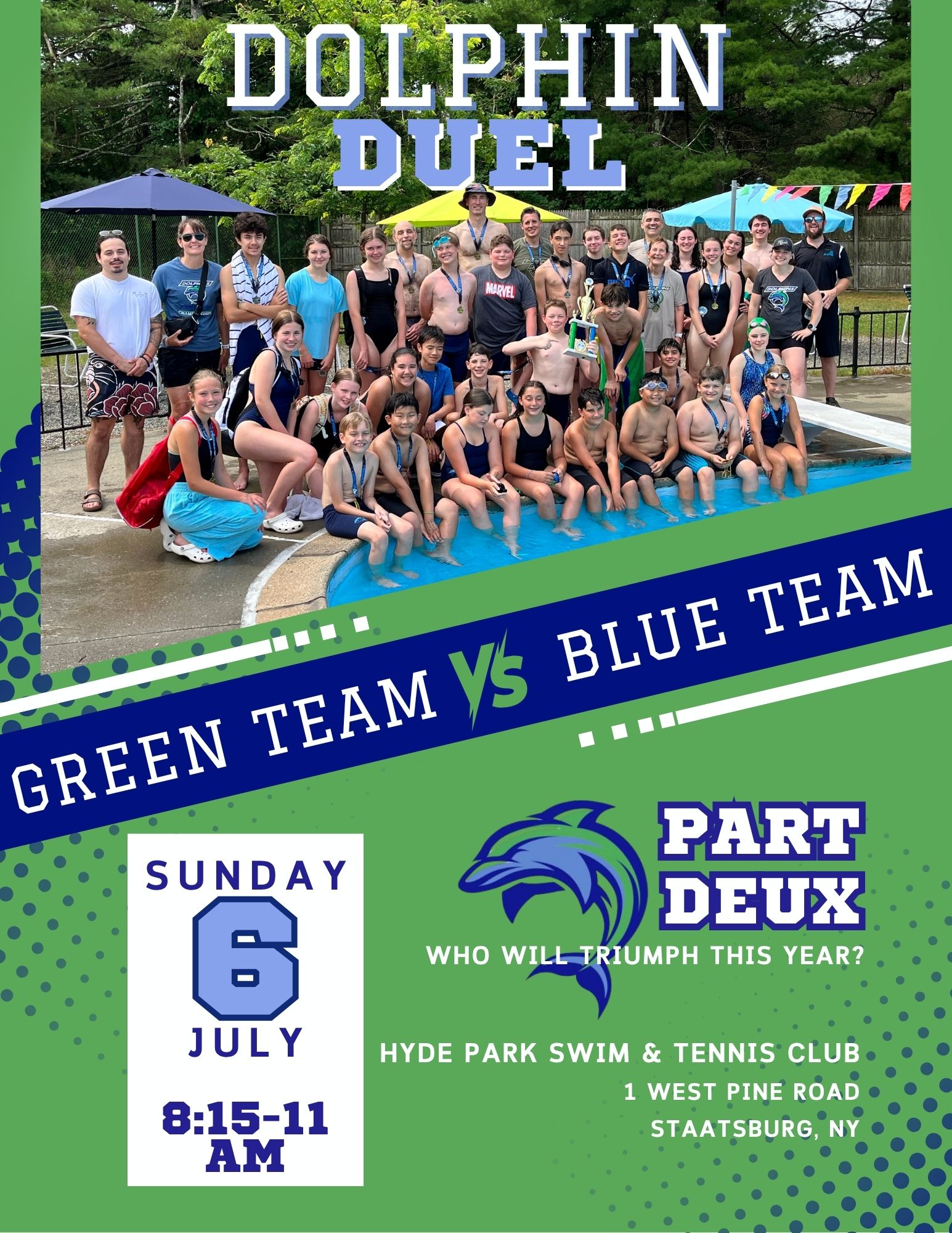 All Dolphin Swimmers...Winter, Spring, Full Year, Masters...are welcome to join in the Summer Fun! The Dolphin Duel will be on Sunday morning, July 6th at the Hyde Park Swim and Tennis Club in Staatsburg/Hyde Park (1 West Pine Rd, Staatsburgh, NY) from 8:15 am to 11:00 am (Warm up at 8:15 am, Start at 9:00 am). Swimmers will be divided into 2 teams, "Green Team" and "Blue Team" by the coaches. Races will mainly be sprints of 50's (2 laps)...with some 100's (4 laps) for those IM fans plus Relays! There may be some crazy races mixed in!