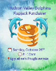 Greetings Dolphins! It is that time of year again...the Dolphins Flapjack Fundraiser at Applebee’s! Come have pancakes served to you by our older Dolphin swimmers!! There will be Dolphin merch, Raffle baskets and a 50/50. It is being held on Sunday, October 26th at Applebee’s in Poughkeepsie (across the street from Marist) from 8am to 10am. Be sure to register by Oct 20th so we can provide a headcout to Applebee's. Tickets are $12 each and can be purchased on the Dolphins website on the Events & Calendar page. Click...