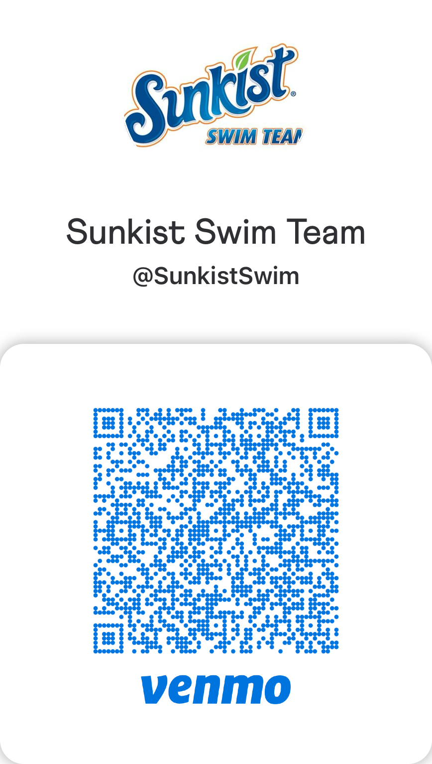 VENMO: The best way to raise money is through our Sunkist Venmo account. You can also raise money the old-fashioned way, checks and cash are encouraged. Mighty cause online giving platform will remain open for donations until 10/1/24. Sunkist Venmo: @SunkistSwim, Please include SWIM-A-THON and swimmer name in the notes section. EX: Swim-a-thon Mixon